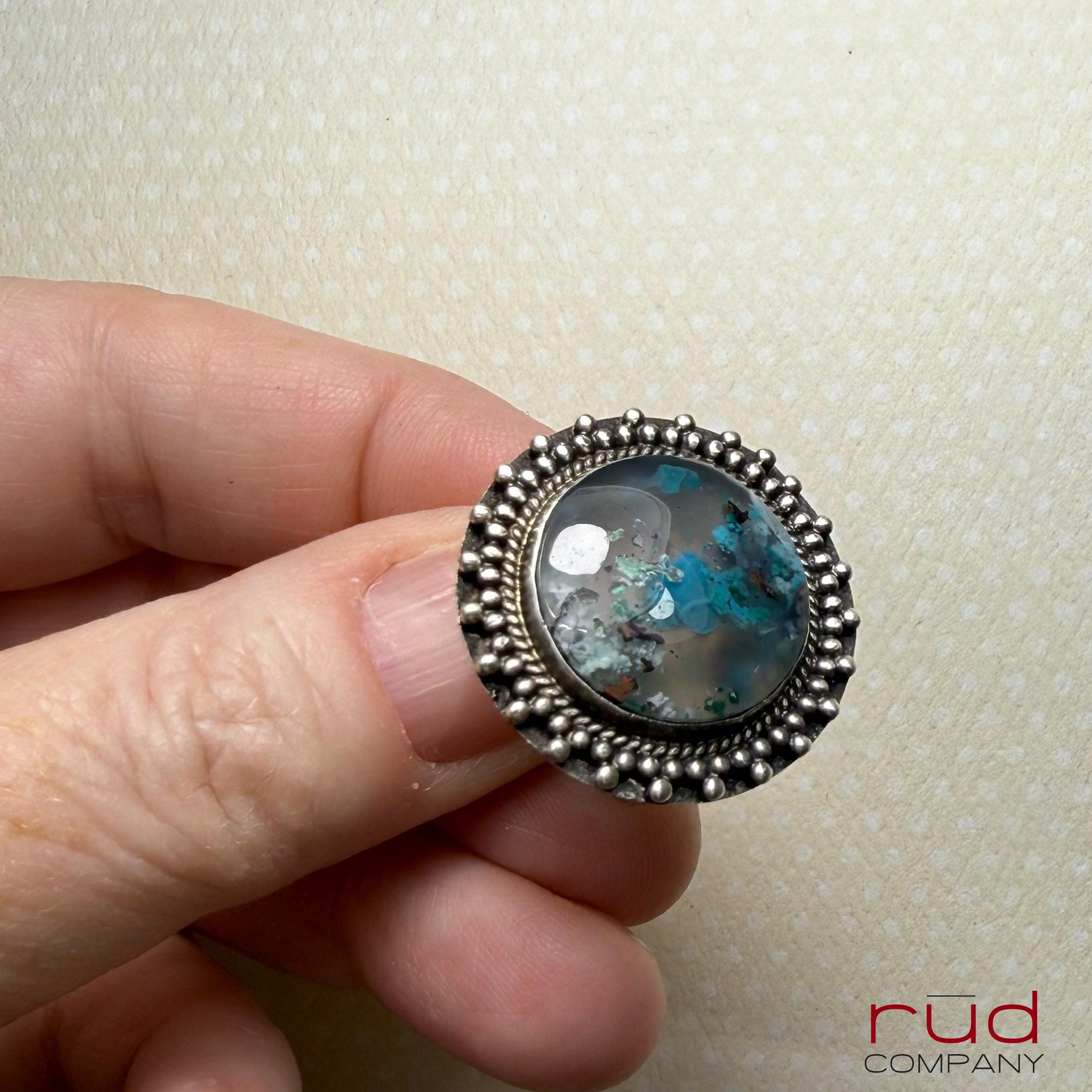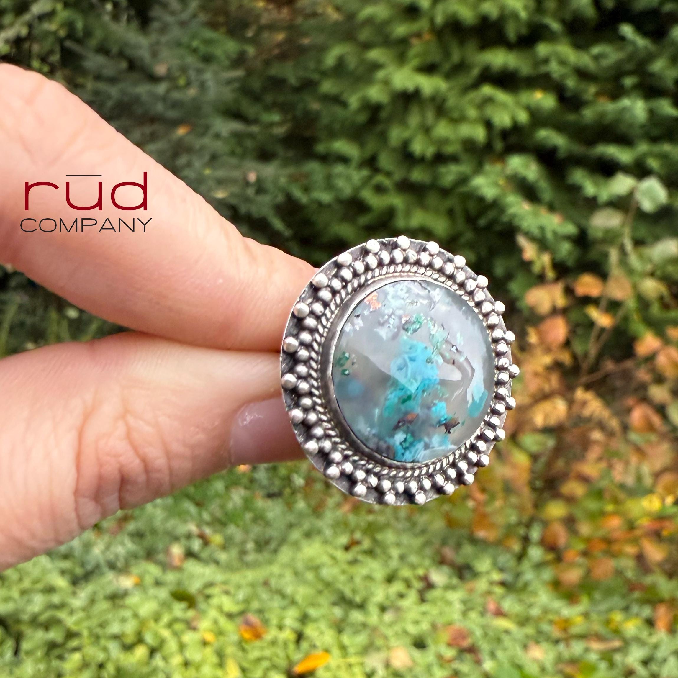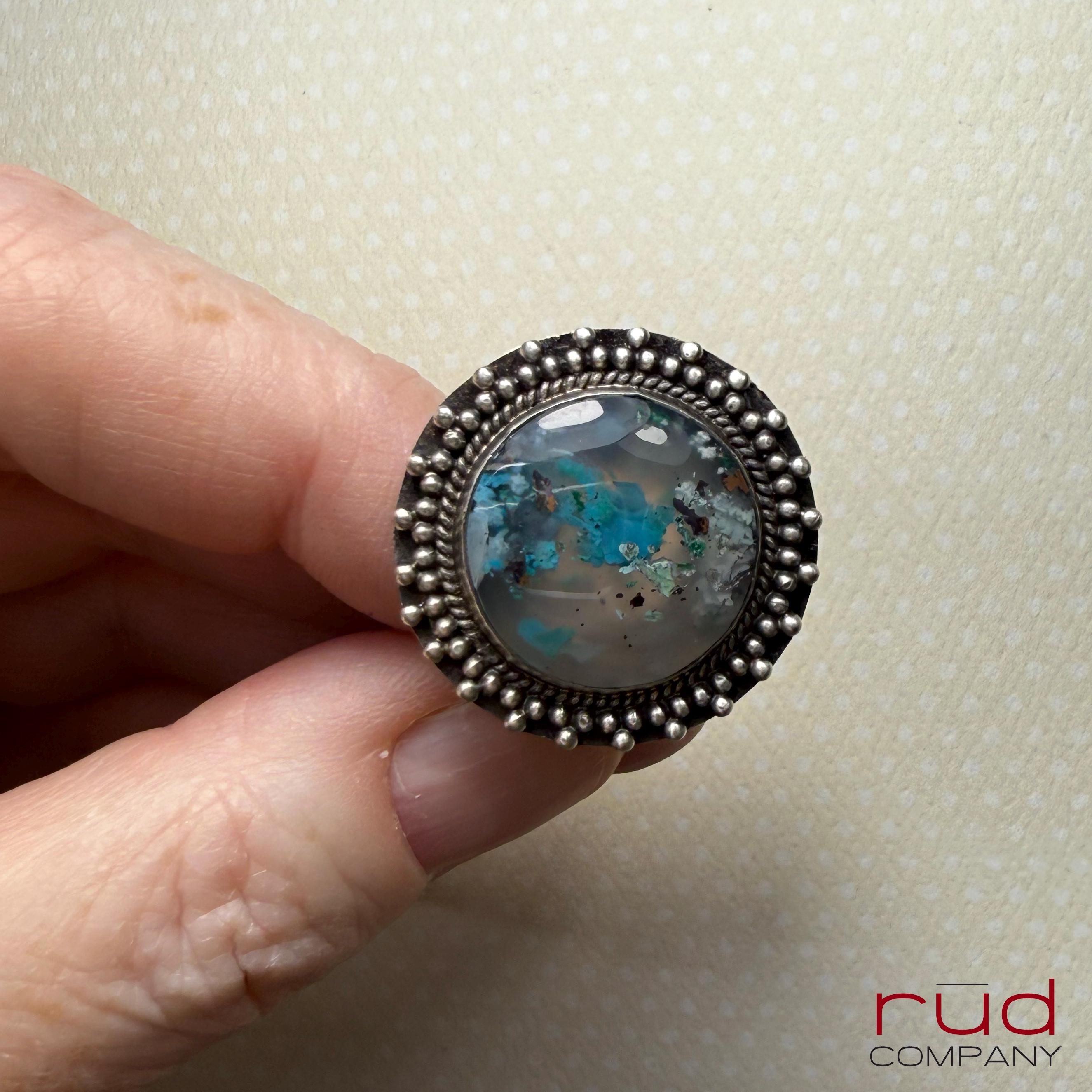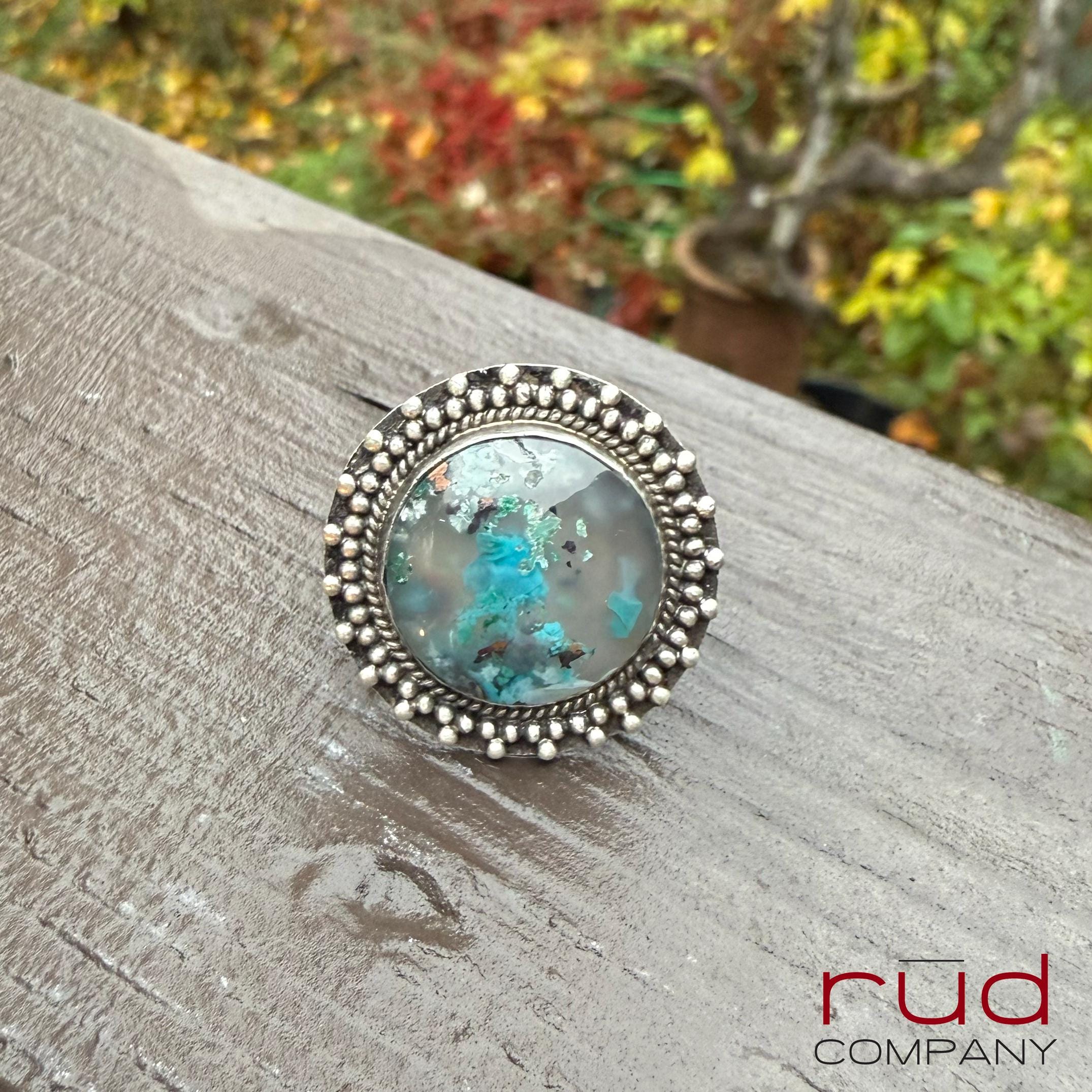 Ocean Looking Glass - Native Copper Chrysocolla in Chalcedony Cabochon Ring artisan Sterling Silver Cocktail Ring, Dotted Style