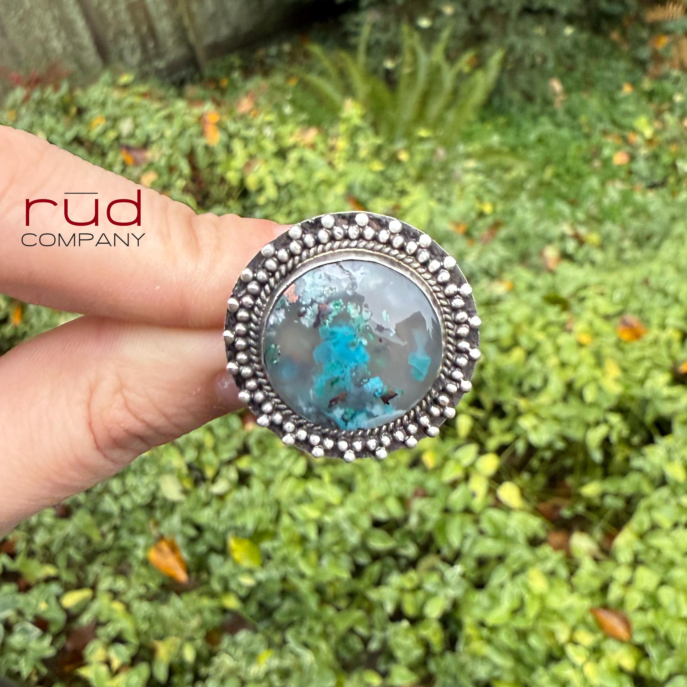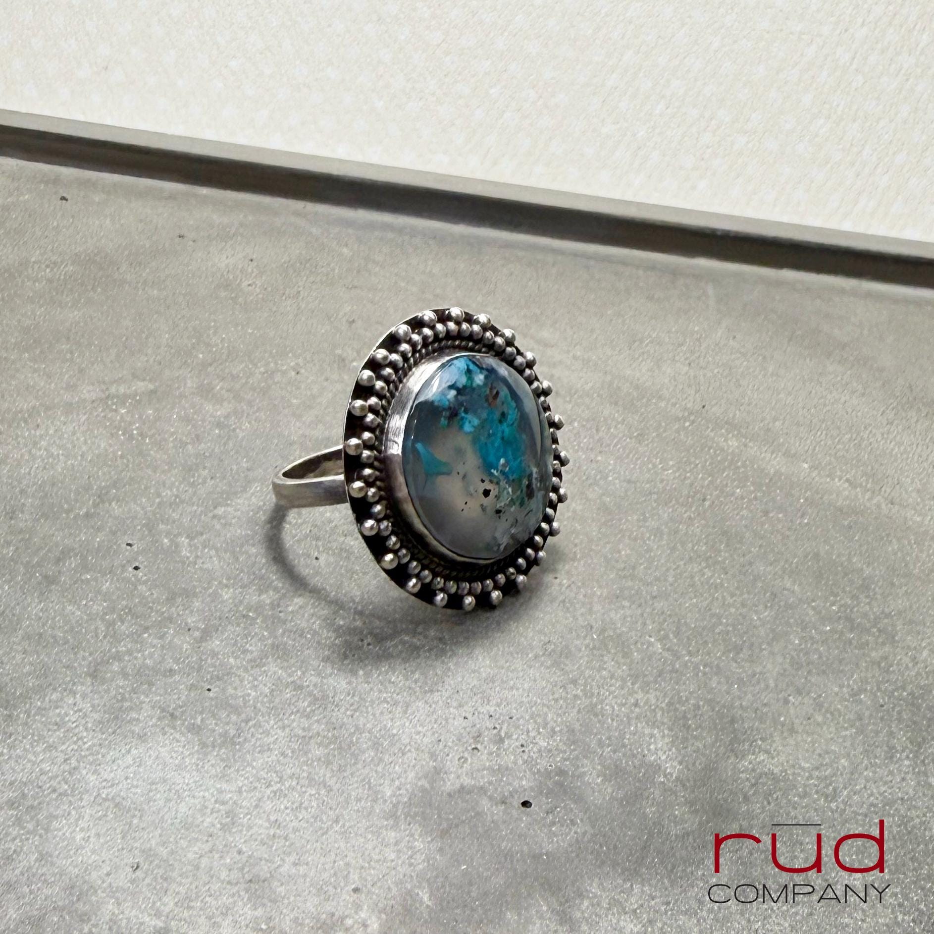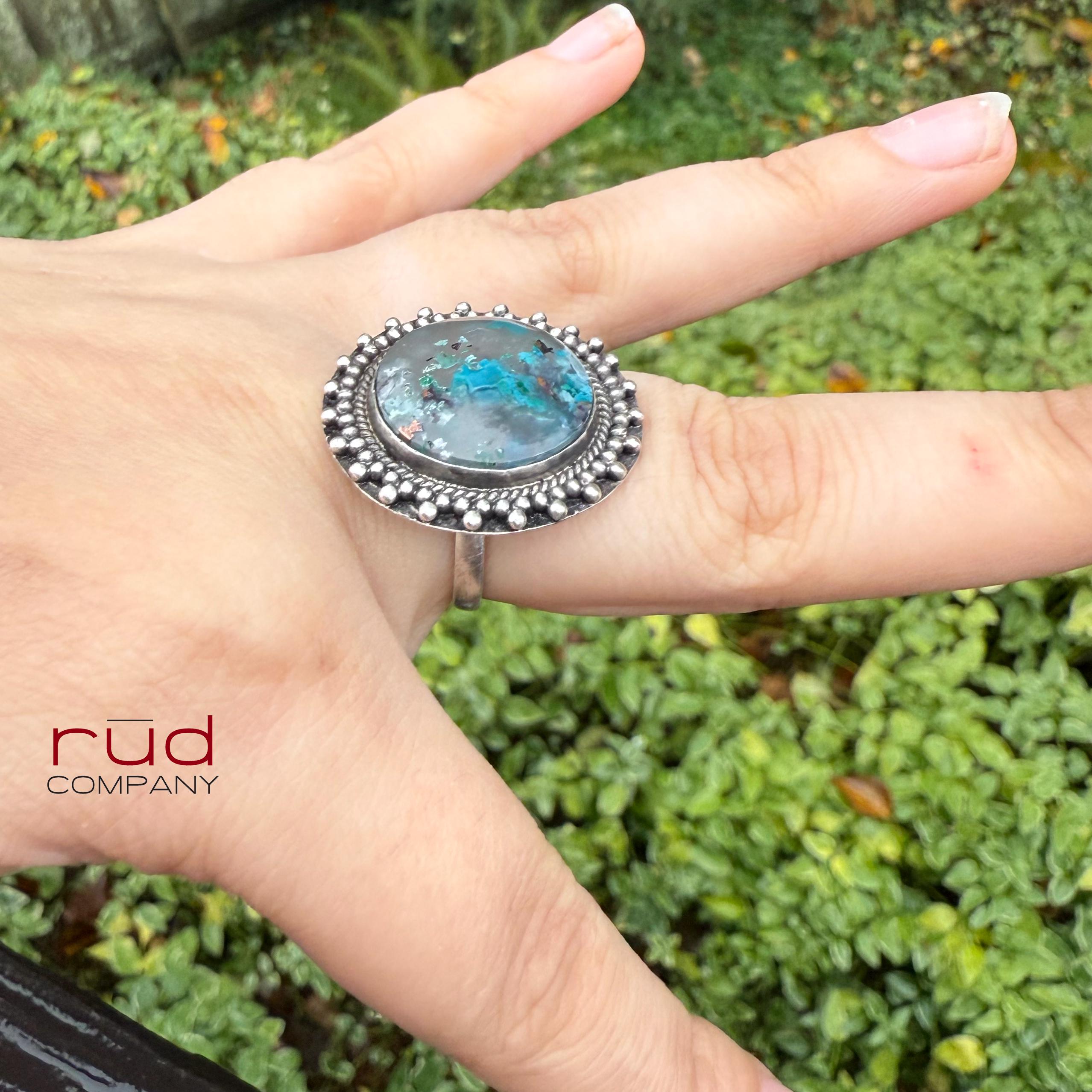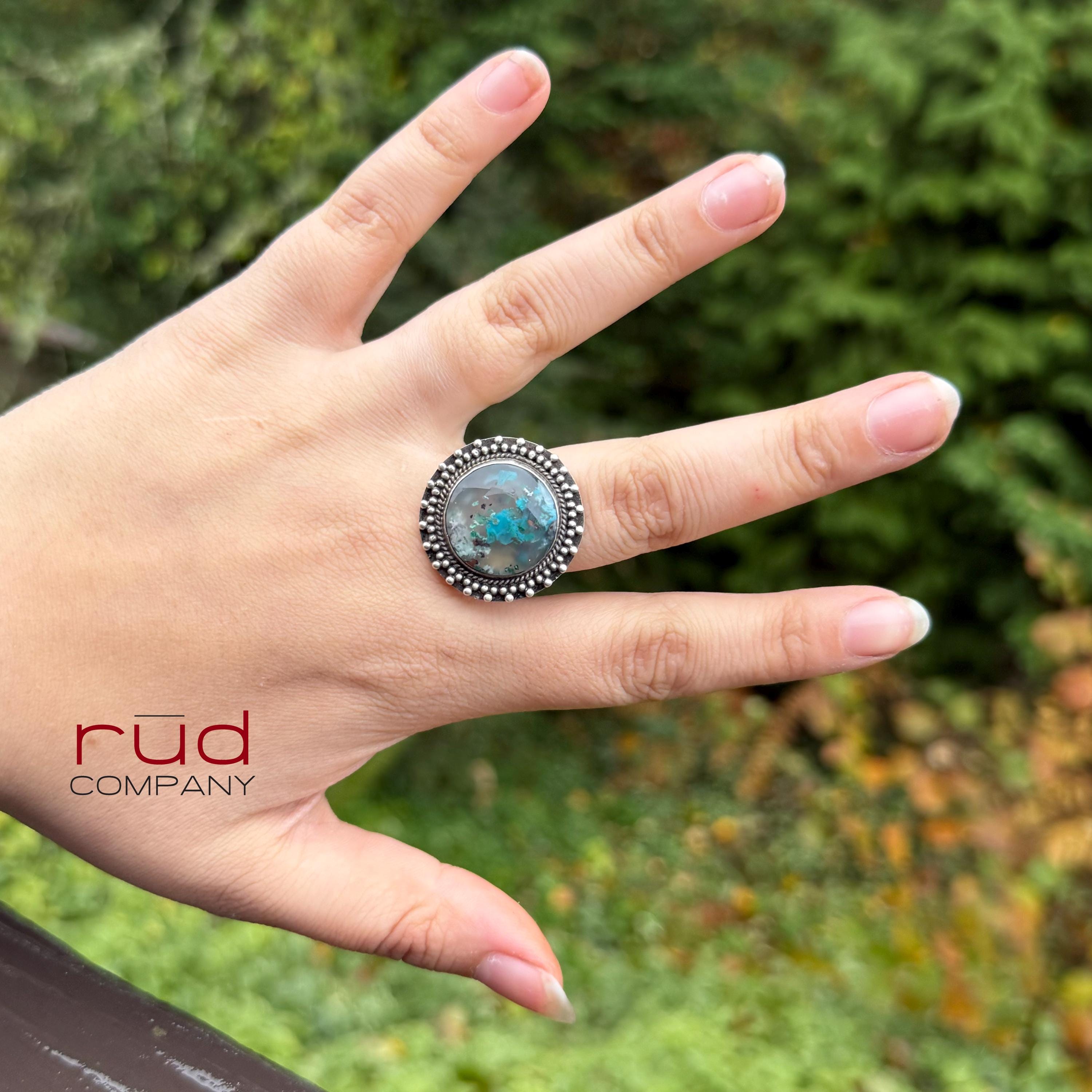 Ocean Looking Glass - Native Copper Chrysocolla in Chalcedony Cabochon Ring artisan Sterling Silver Cocktail Ring, Dotted Style