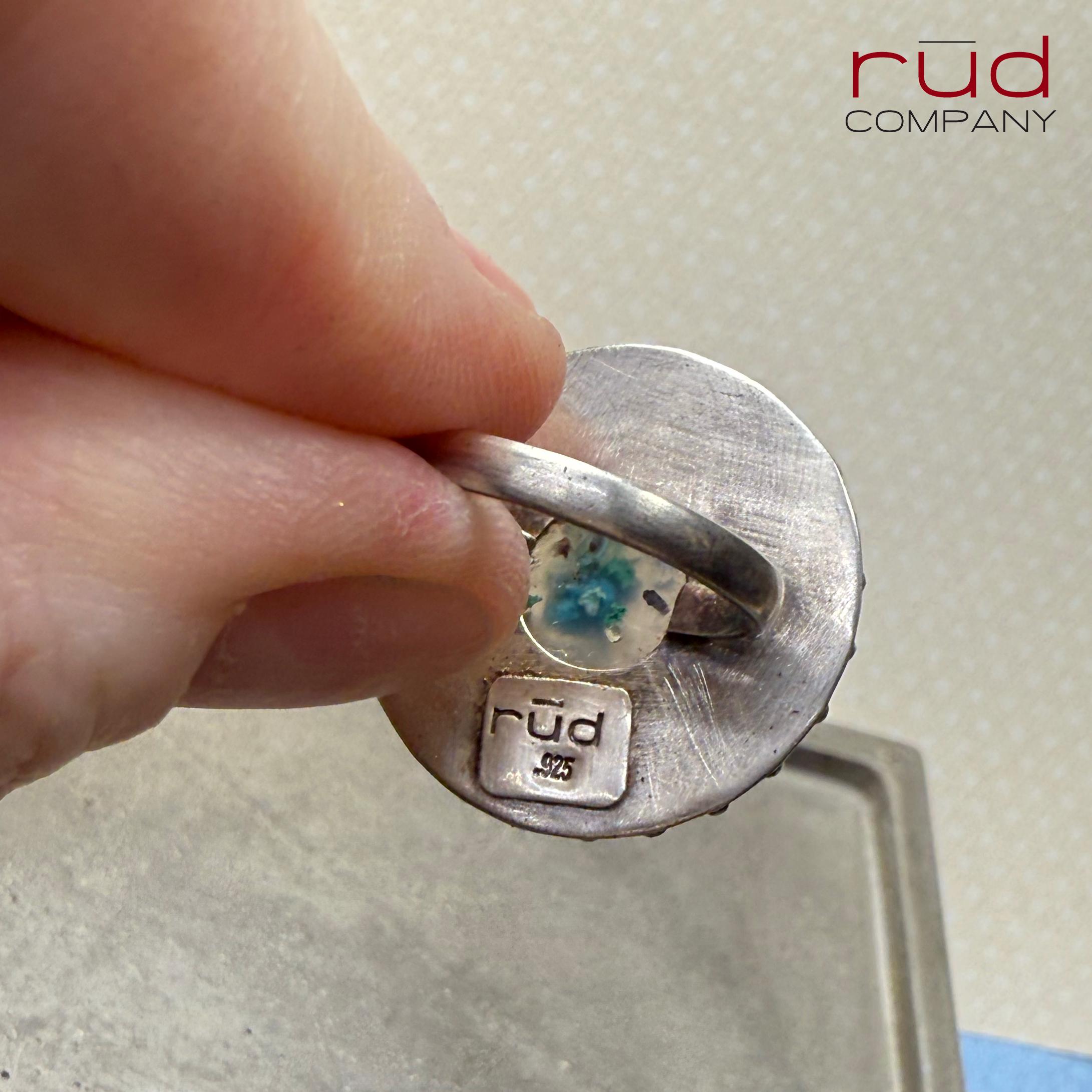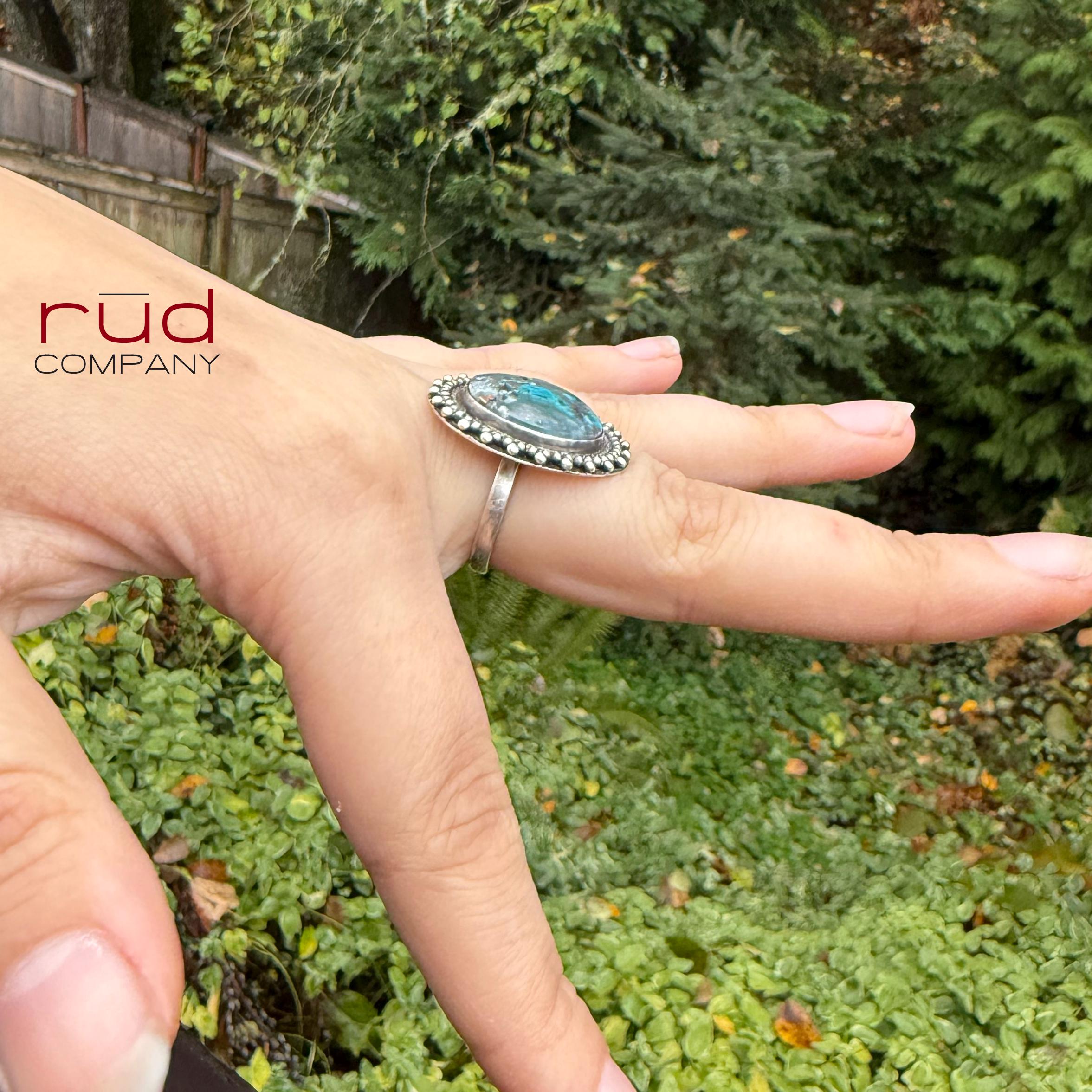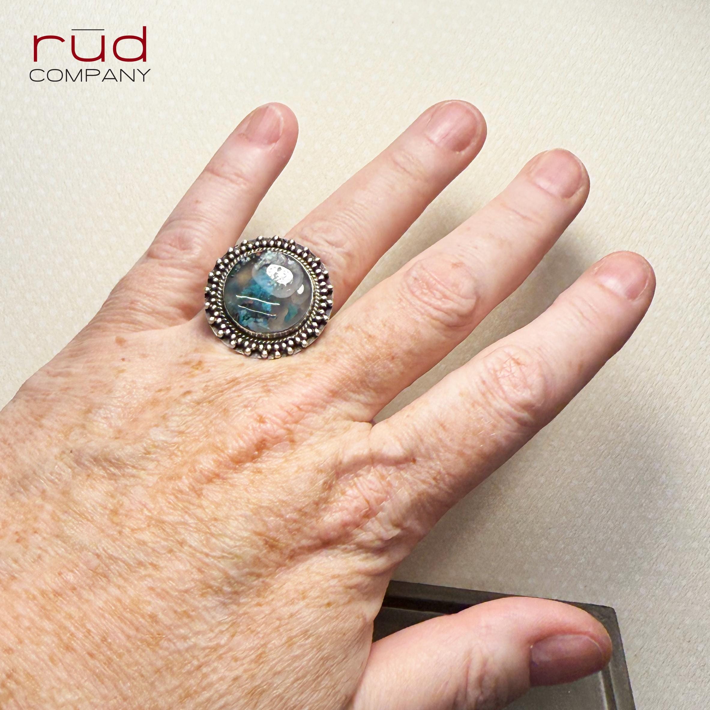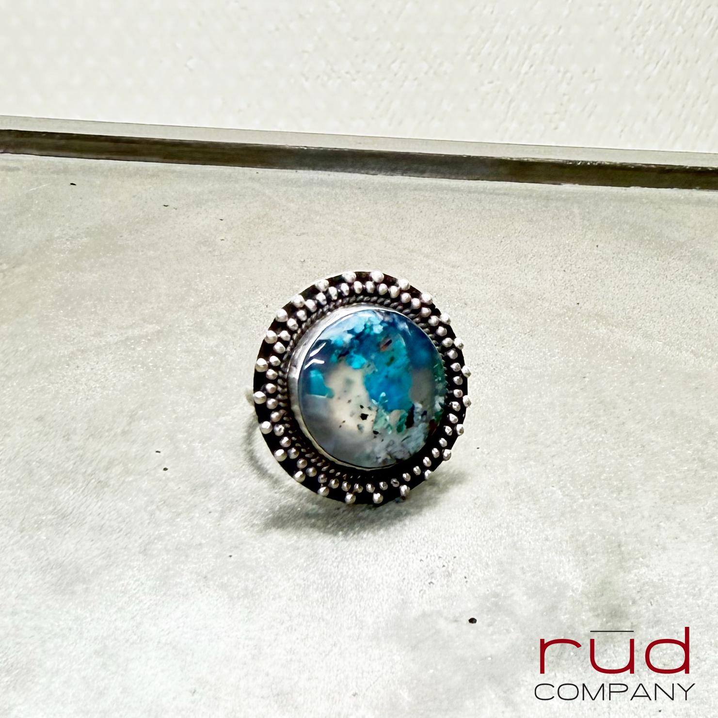 Ocean Looking Glass - Native Copper Chrysocolla in Chalcedony Cabochon Ring artisan Sterling Silver Cocktail Ring, Dotted Style