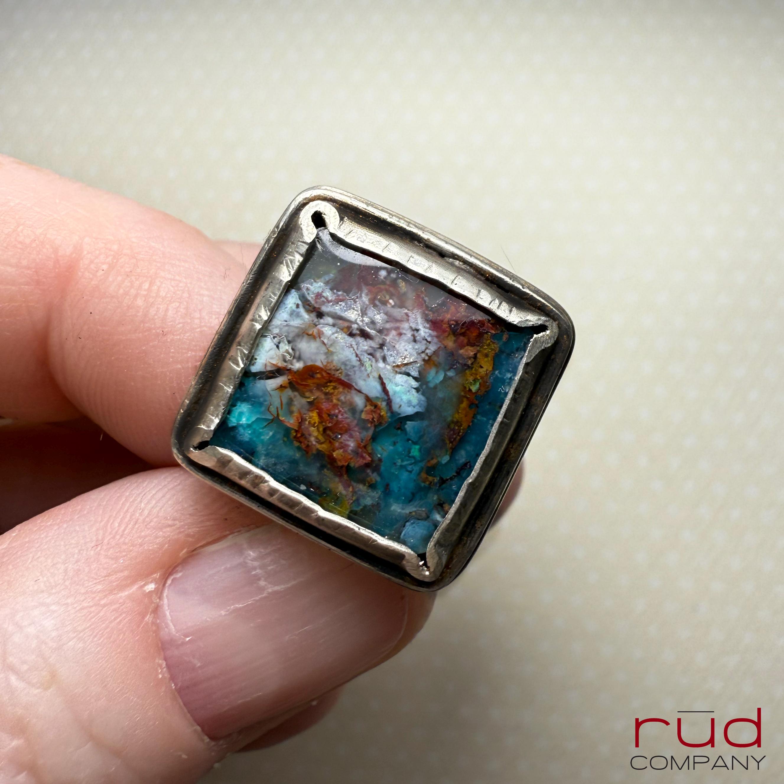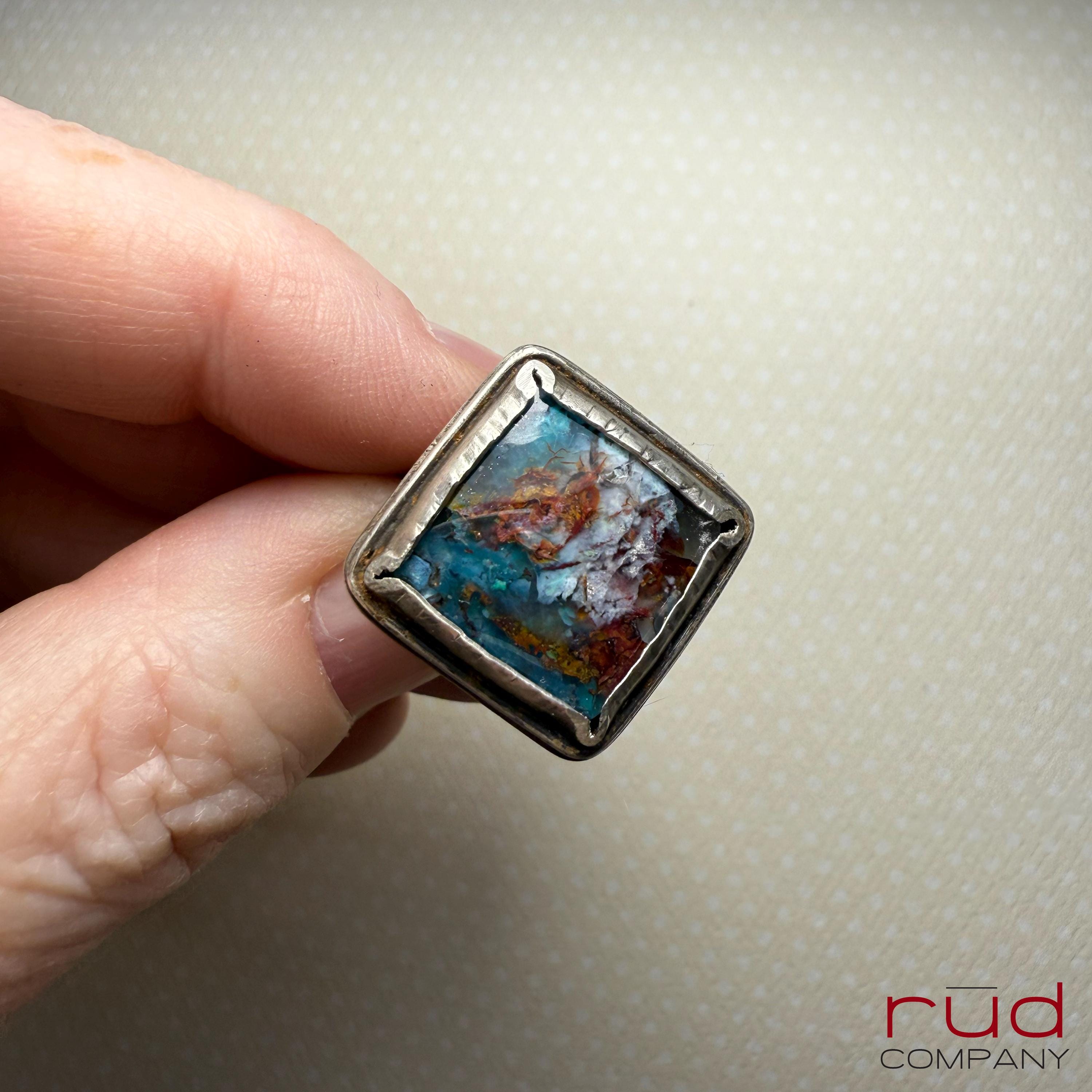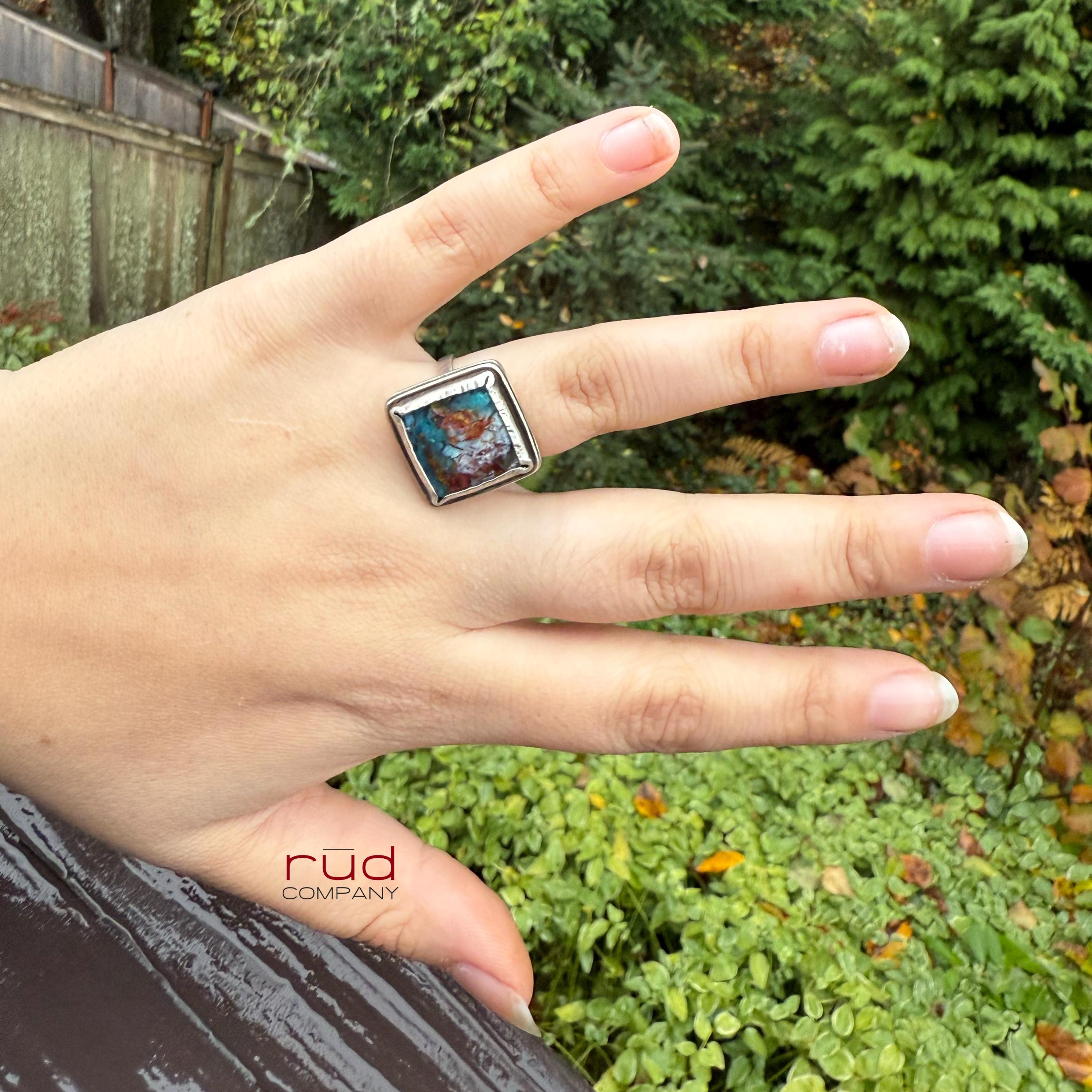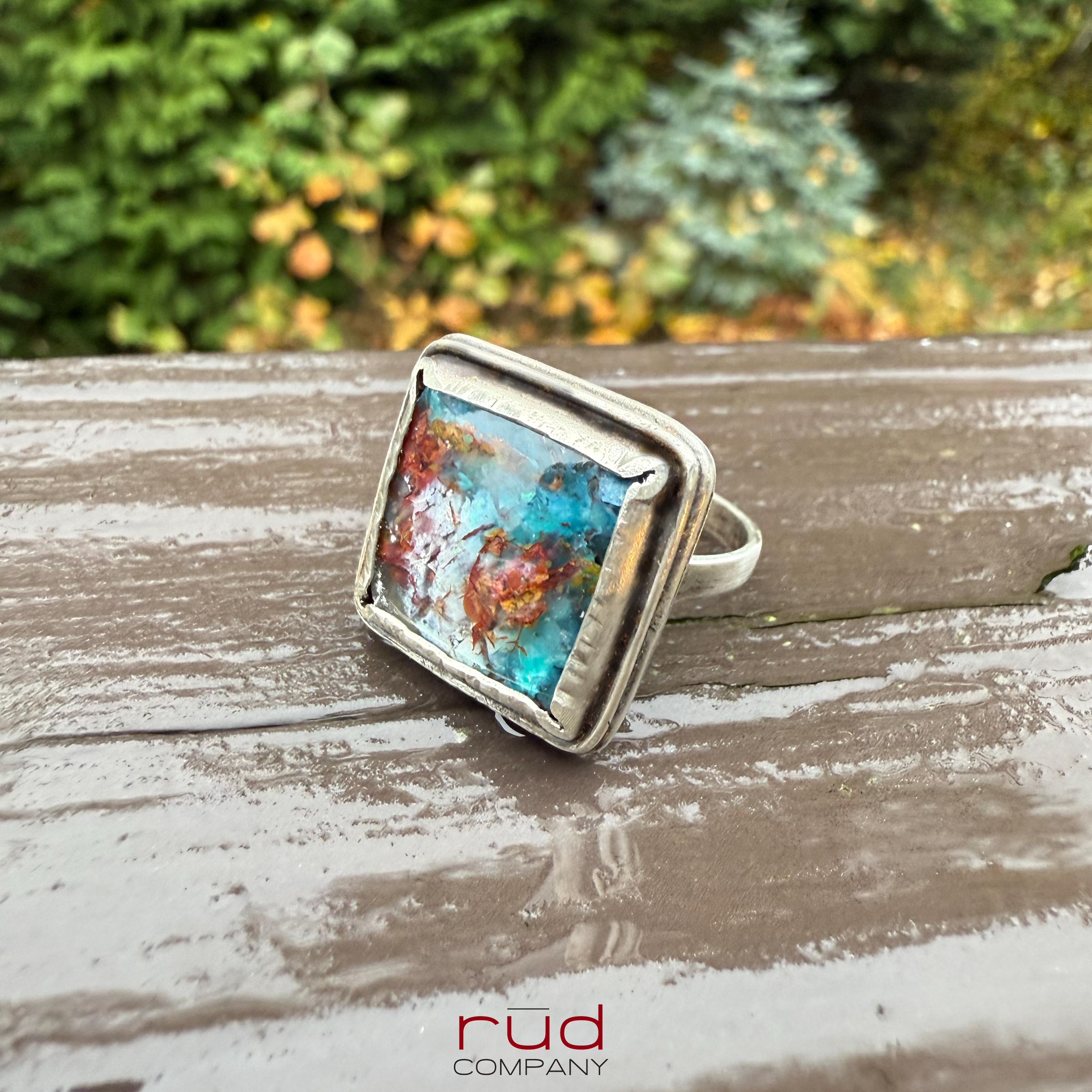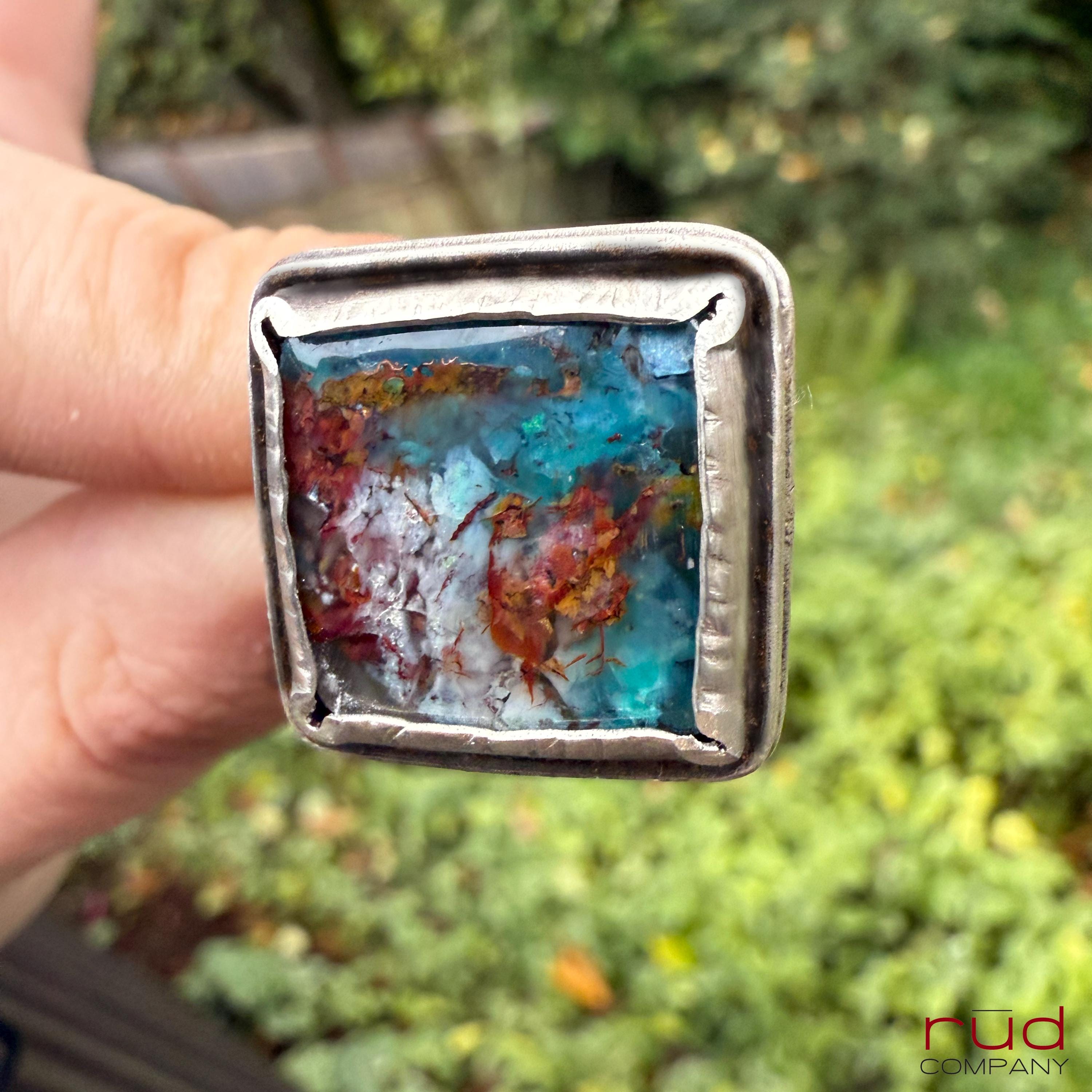 Springwater Portal - Native Copper Chrysocolla in Chalcedony Cabochon Ring artisan Sterling Silver Cocktail Ring, Square Rustic Style Teal