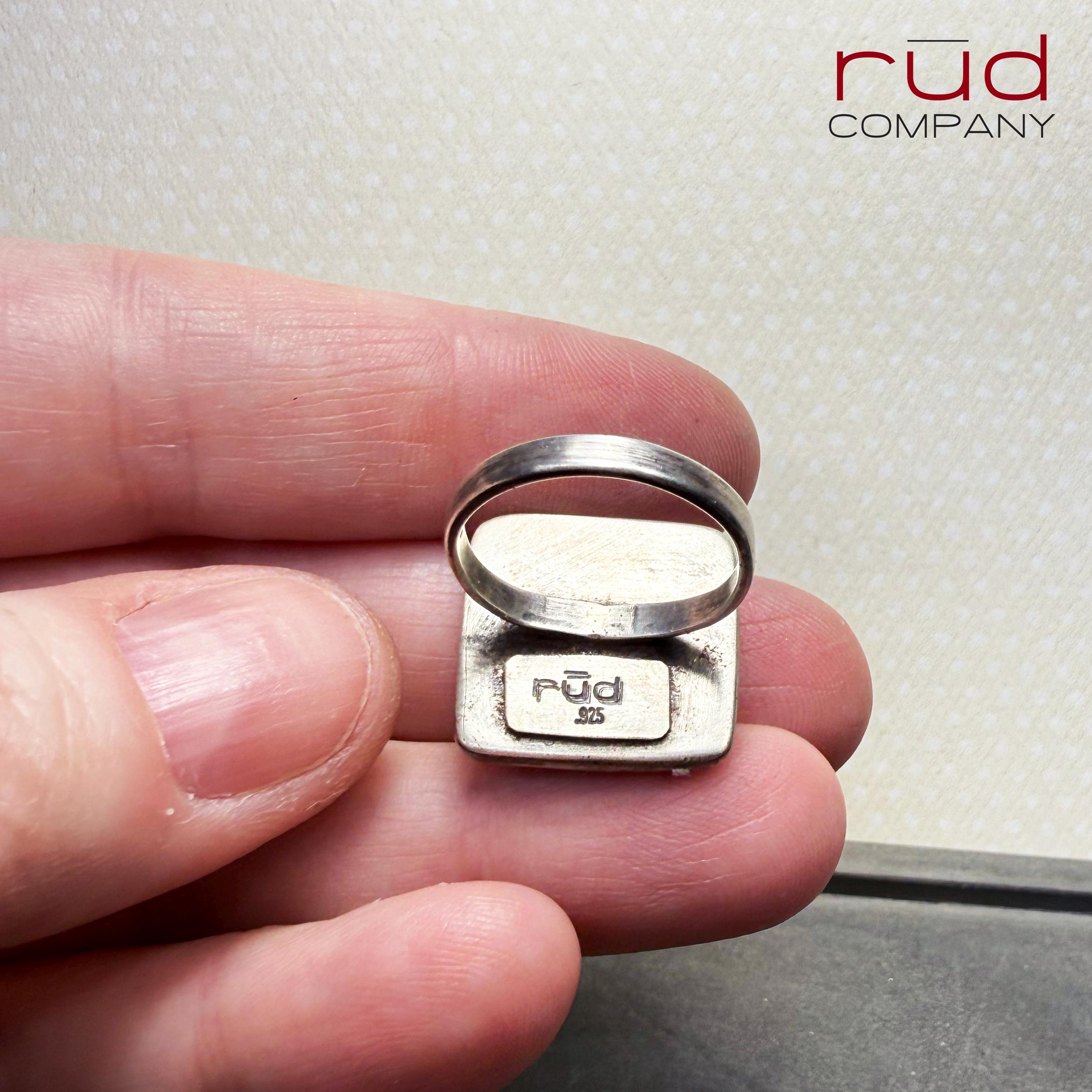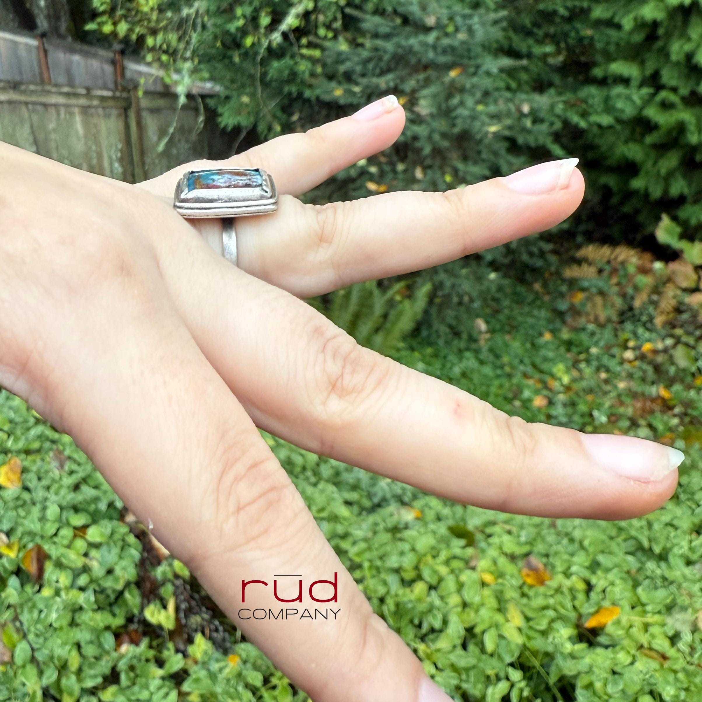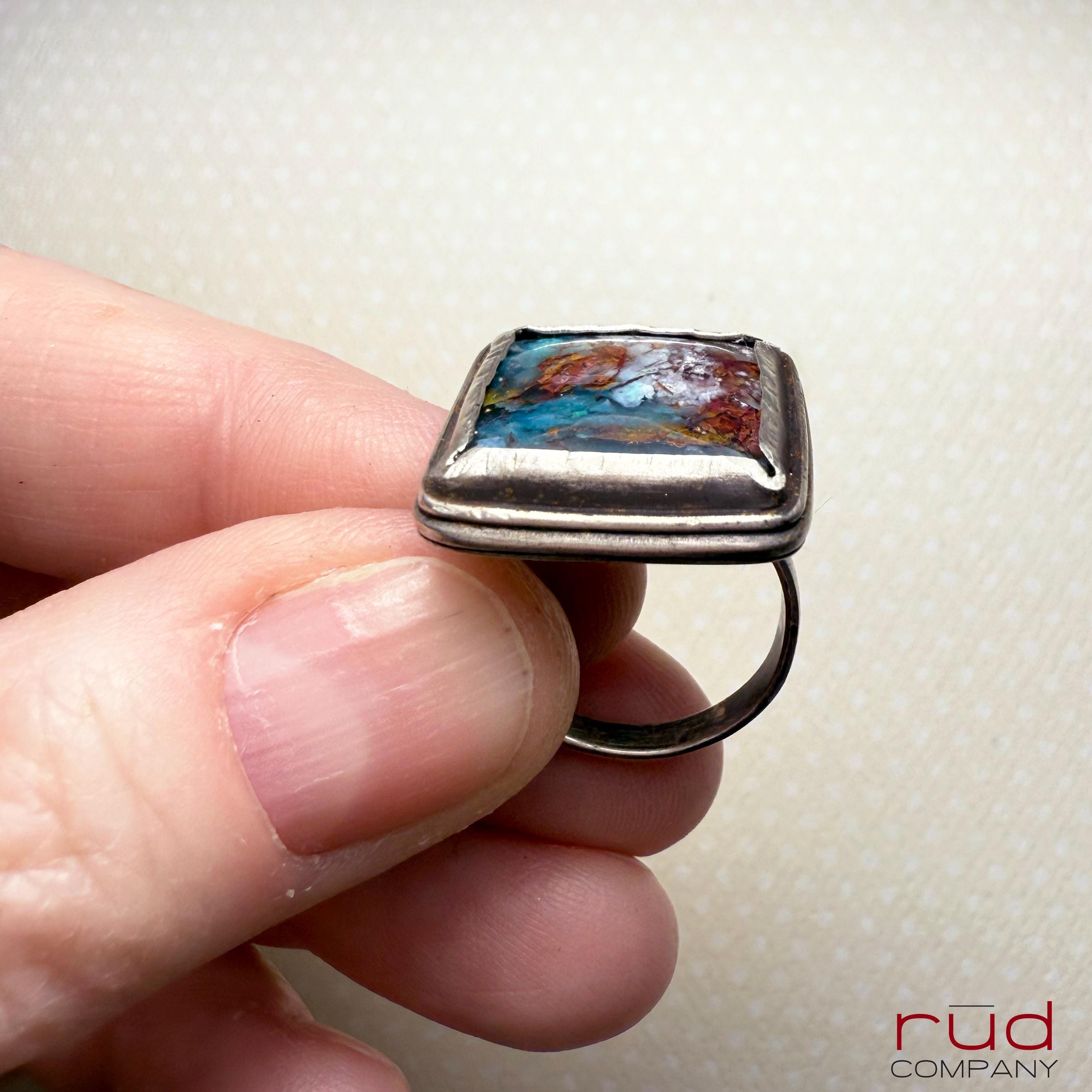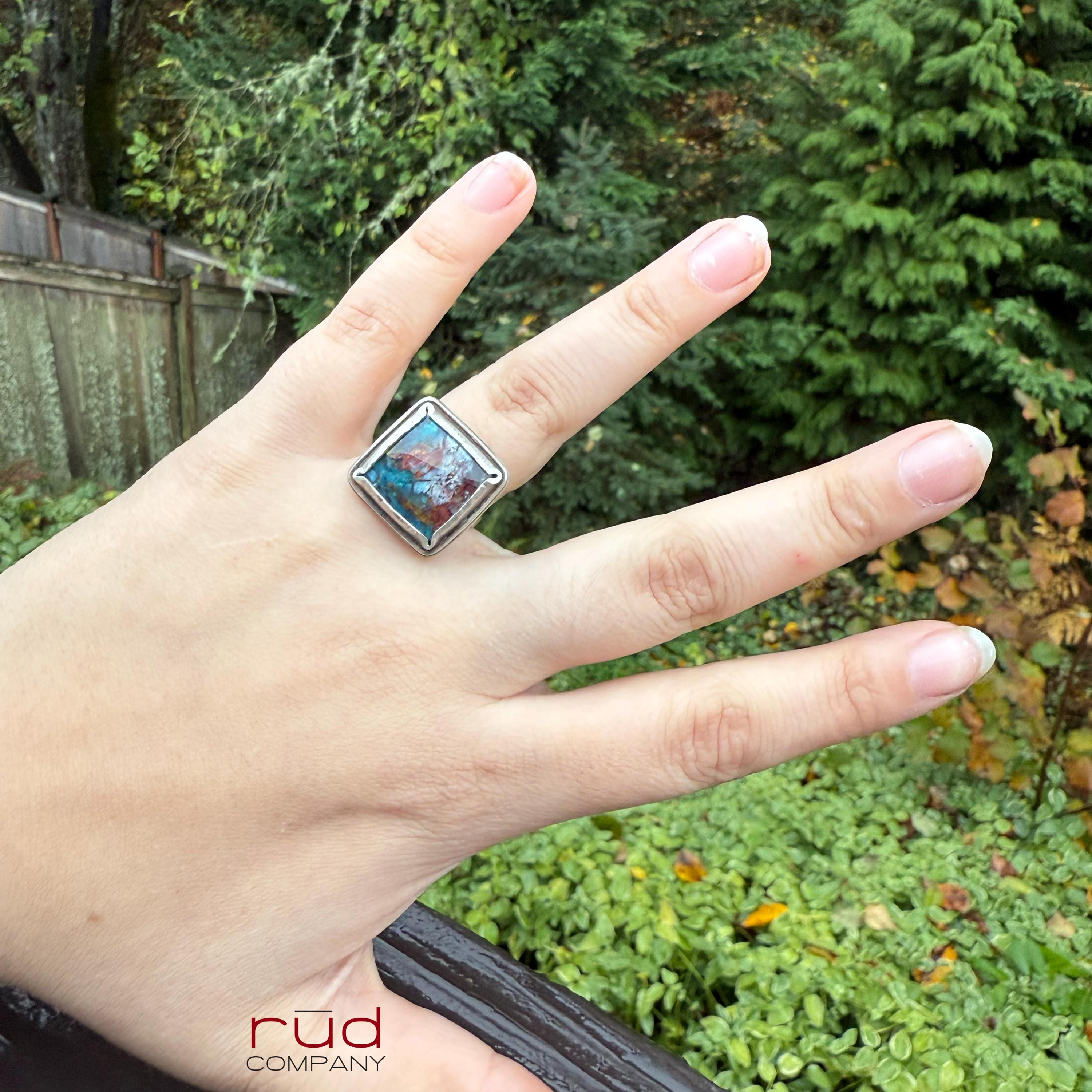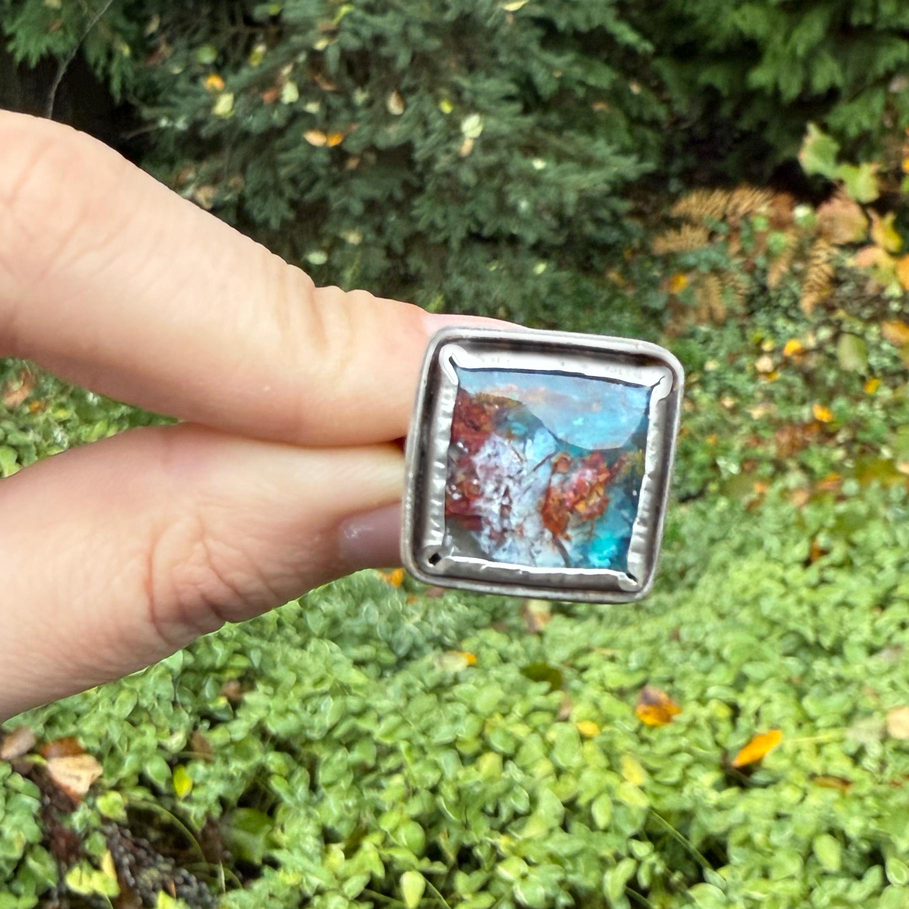Springwater Portal - Native Copper Chrysocolla in Chalcedony Cabochon Ring artisan Sterling Silver Cocktail Ring, Square Rustic Style Teal