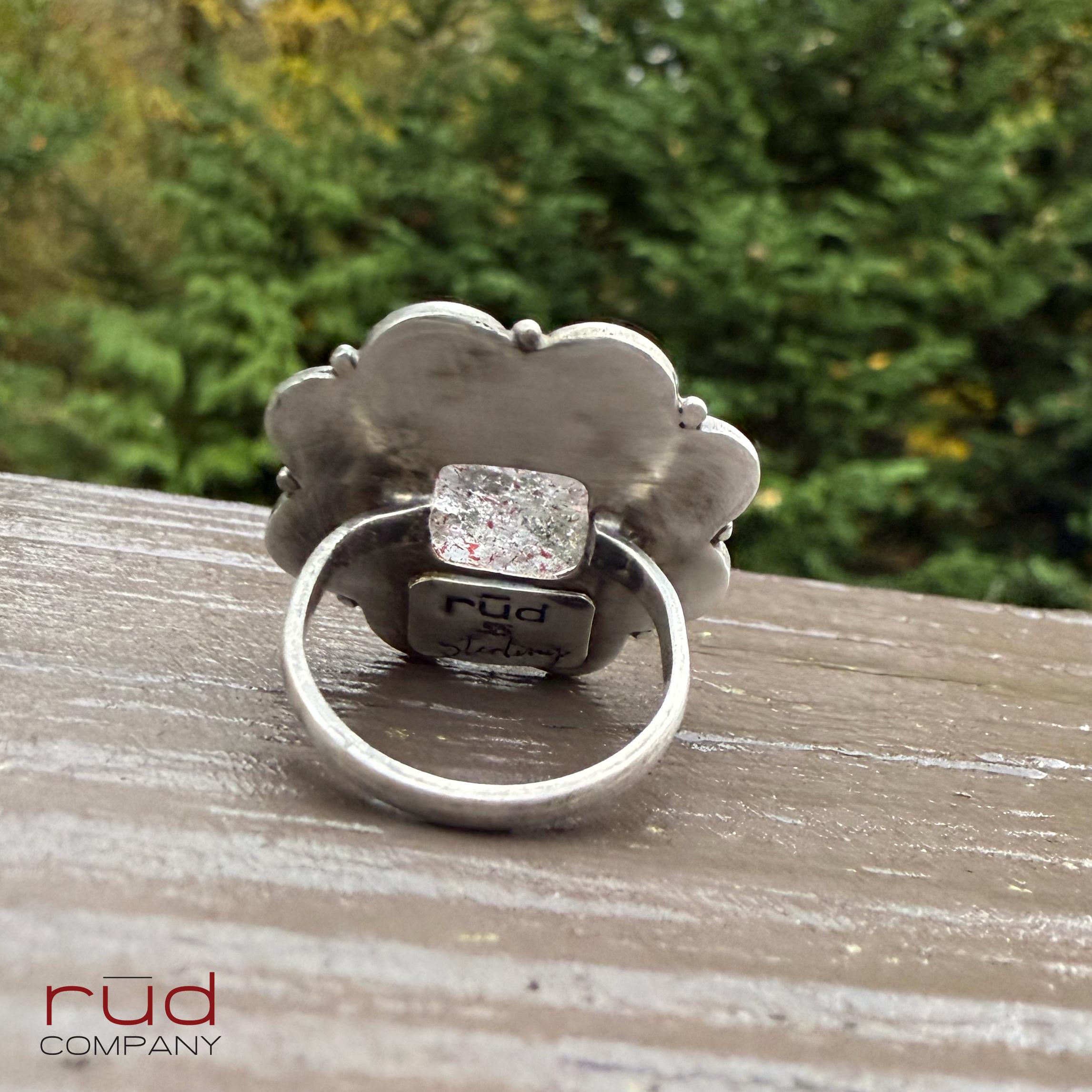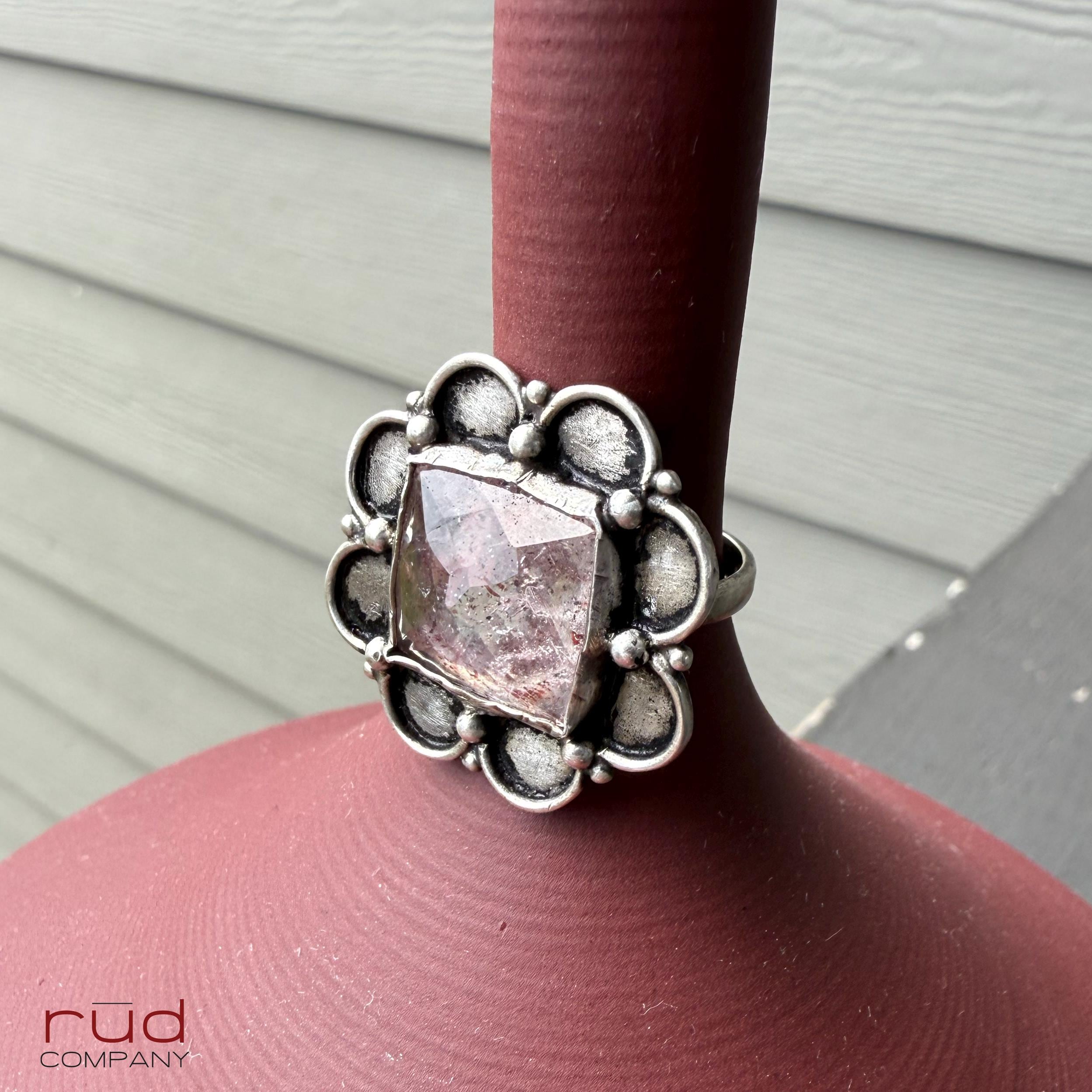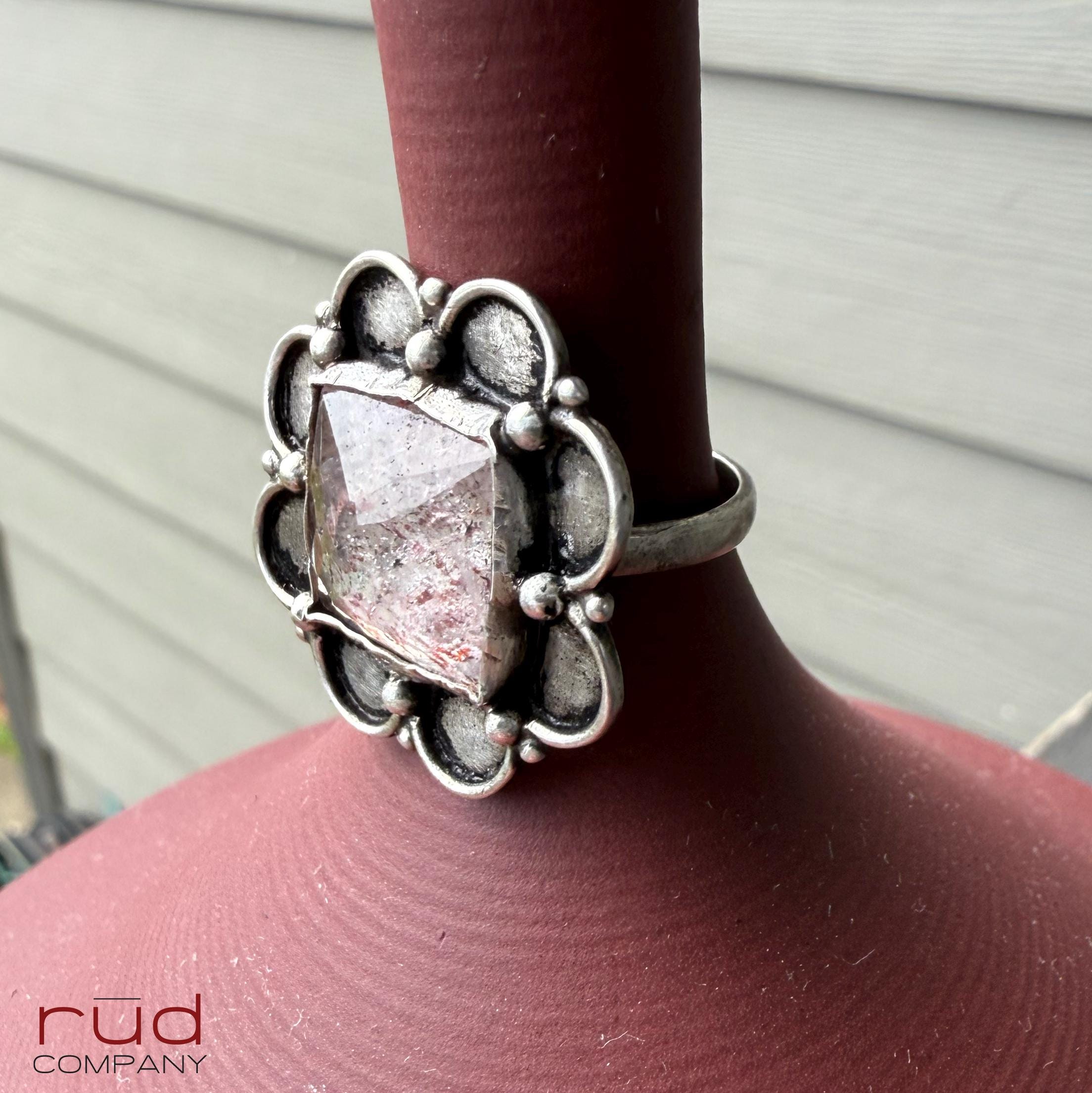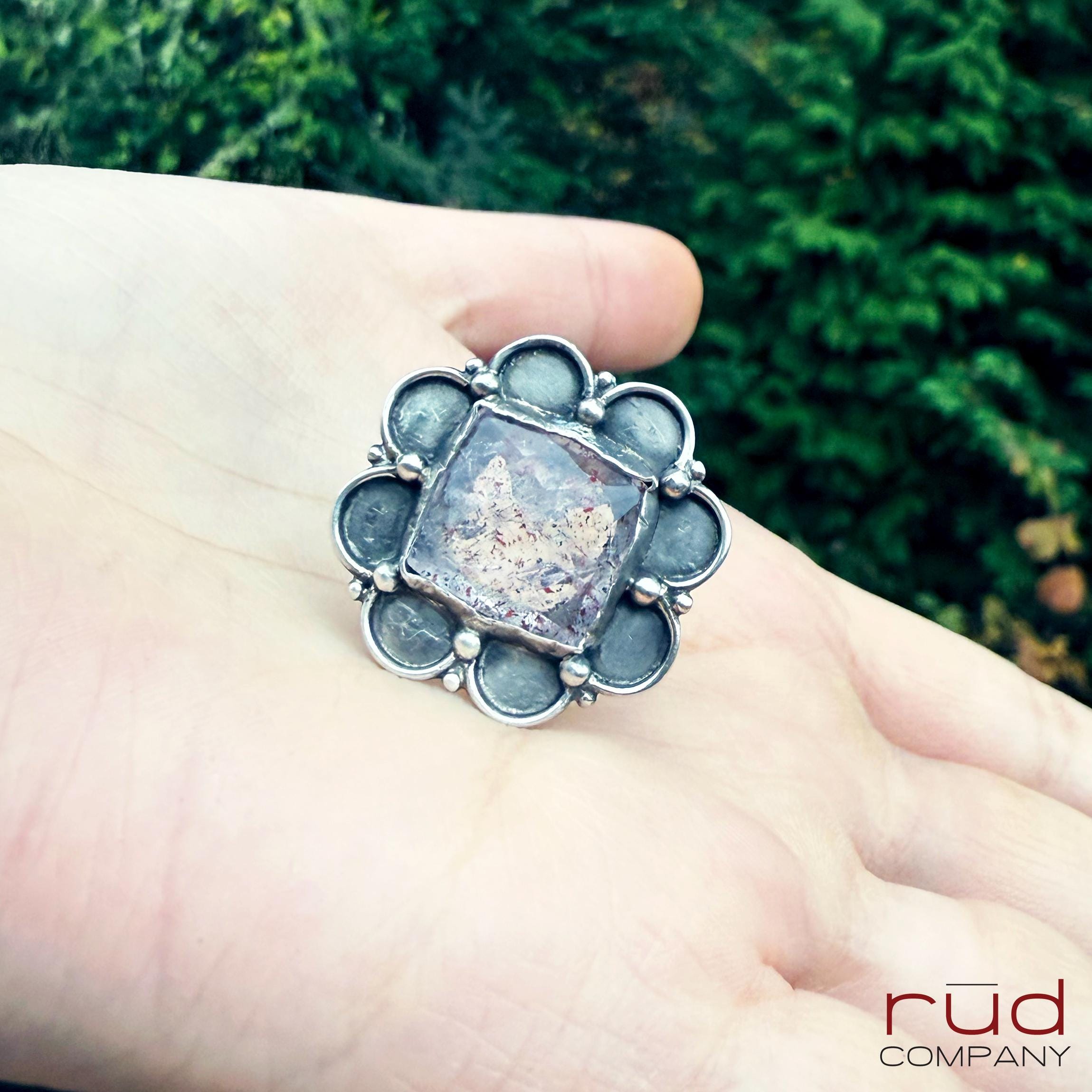 Seventh Element - Super Seven / Cacoxenite /Melody Stone Cabochon Ring artisan Sterling Silver Cocktail Ring, Square Rustic Petals Size 8