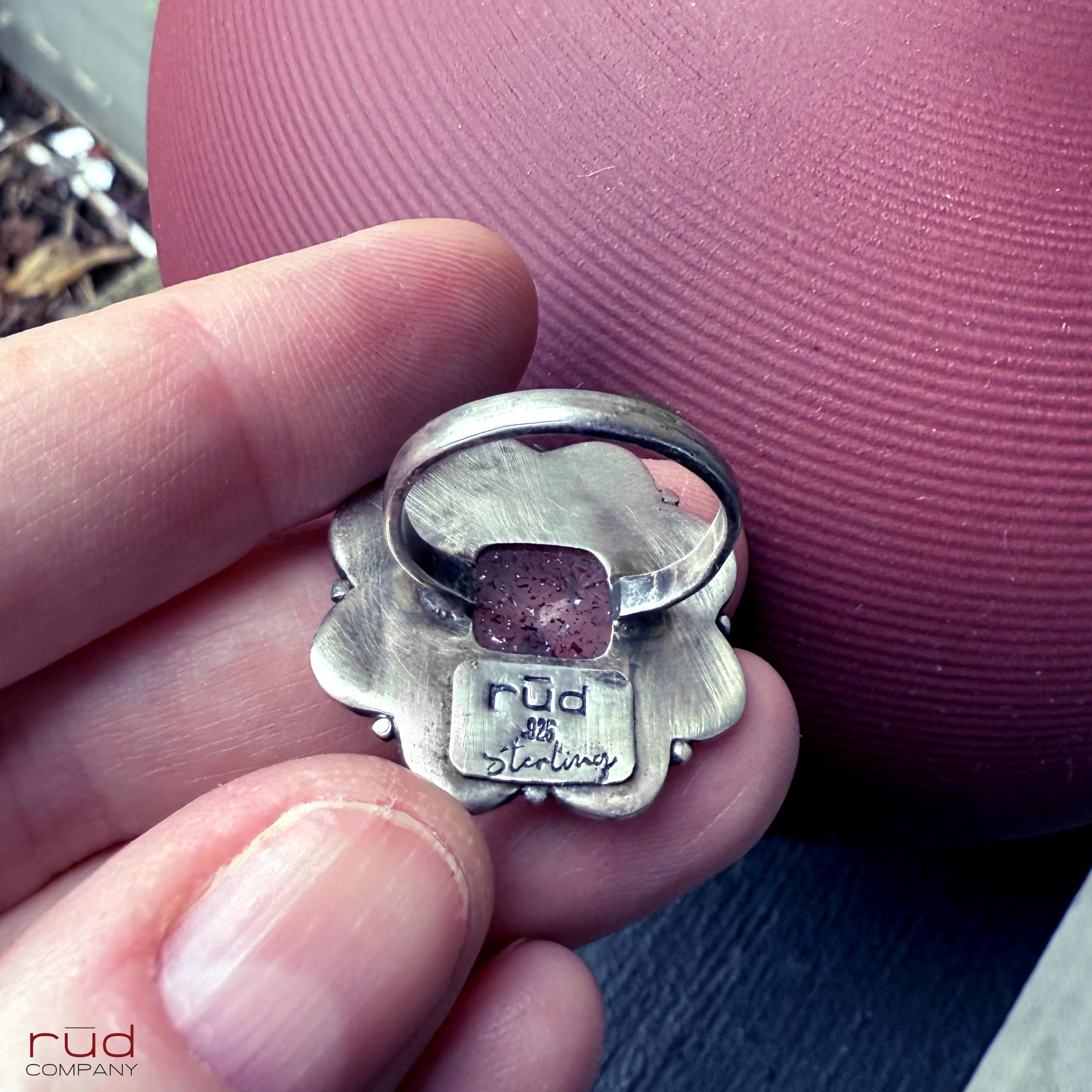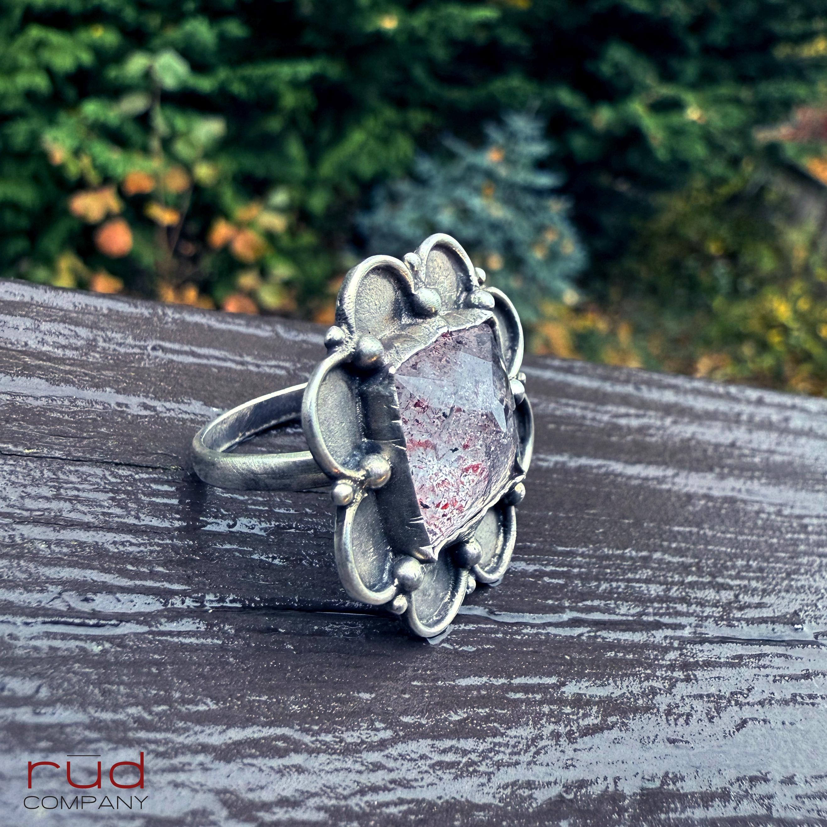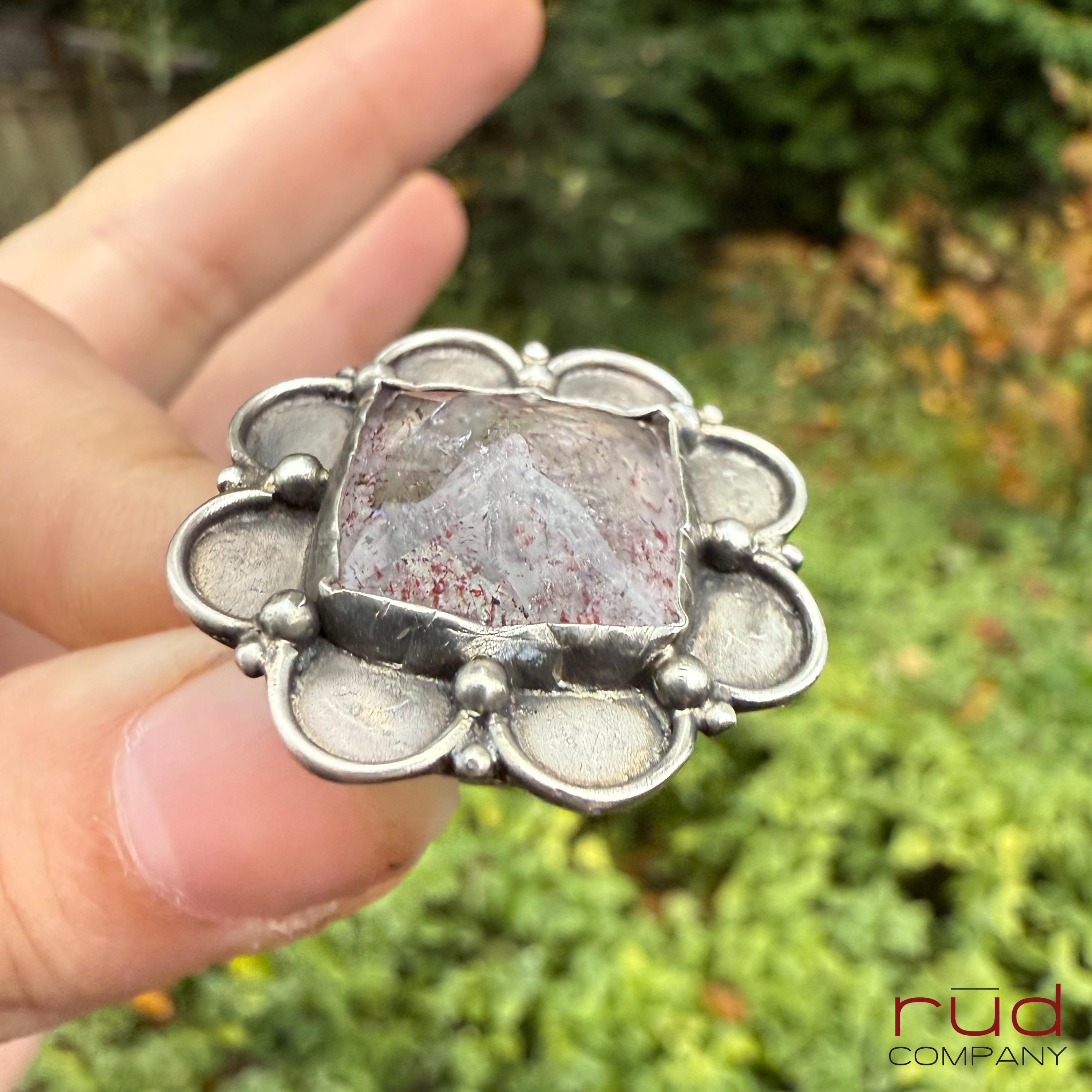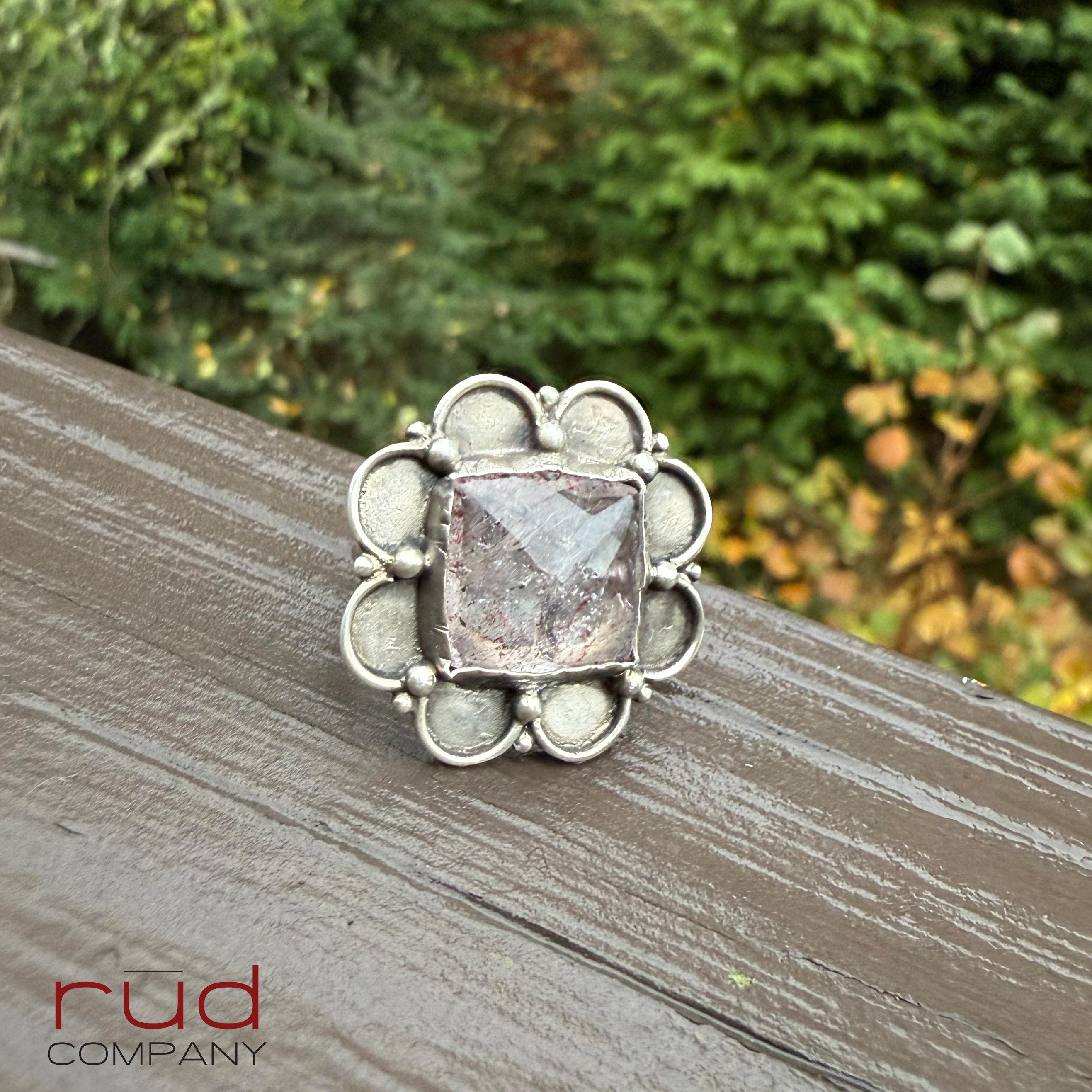 Seventh Element - Super Seven / Cacoxenite /Melody Stone Cabochon Ring artisan Sterling Silver Cocktail Ring, Square Rustic Petals Size 8