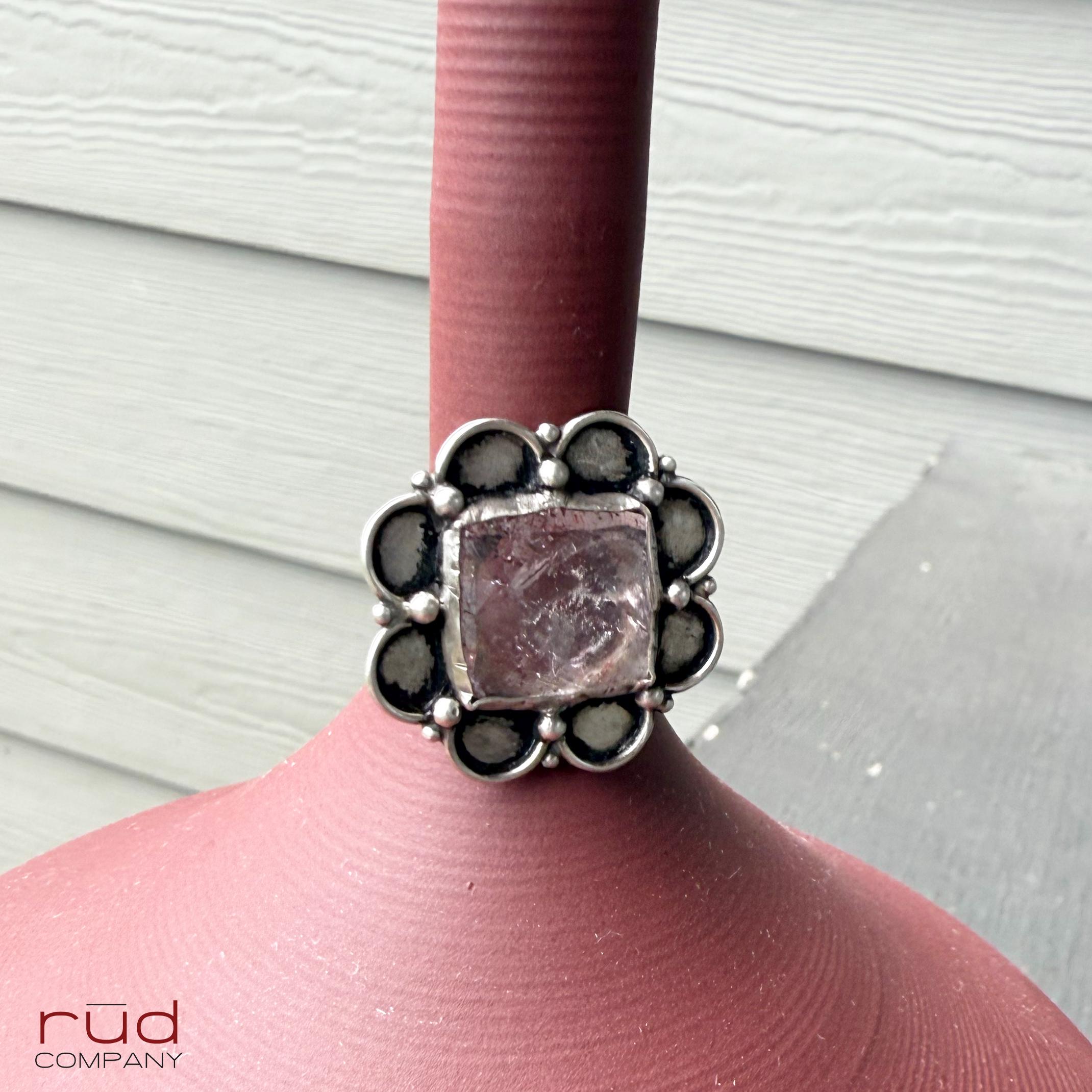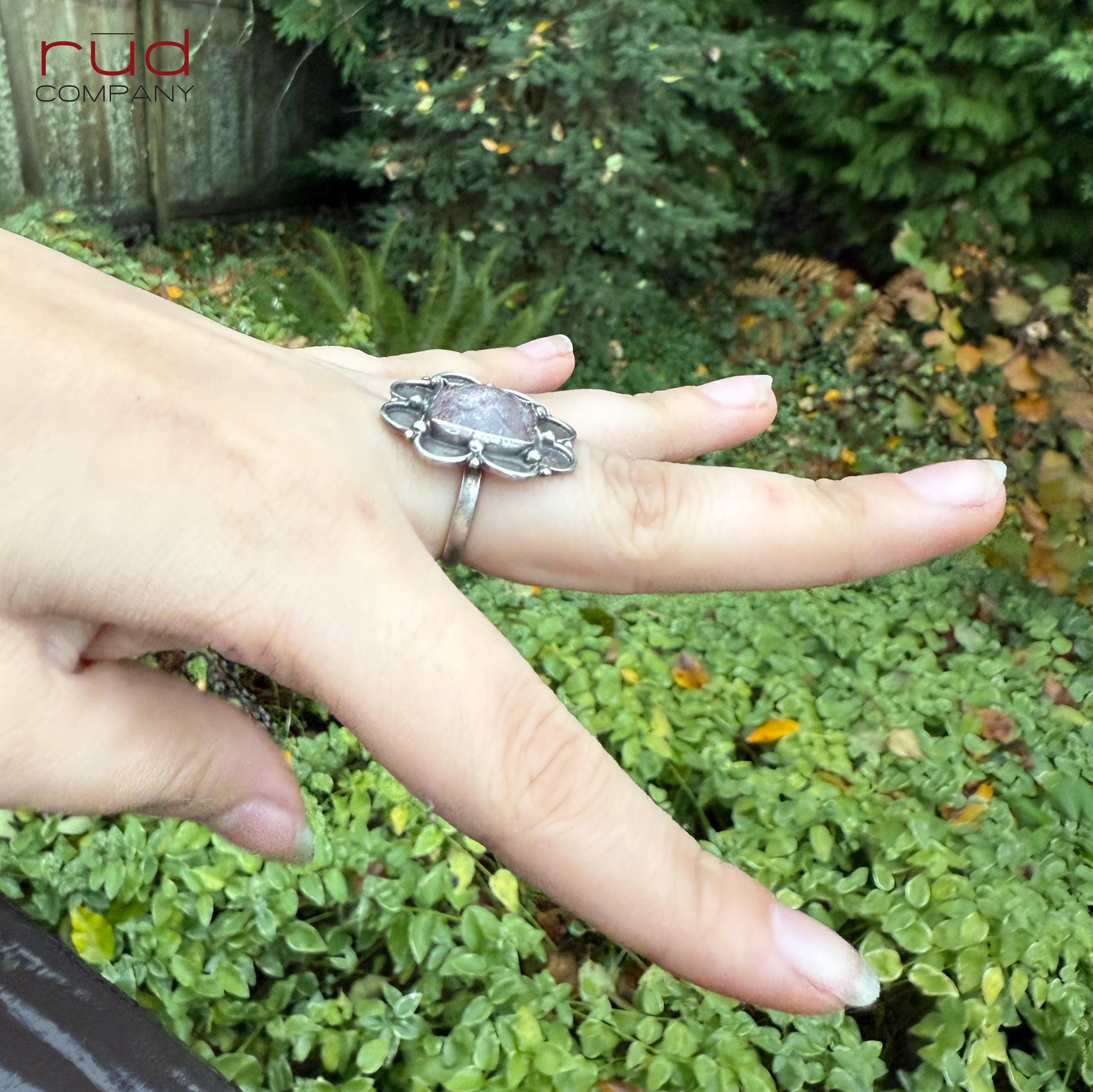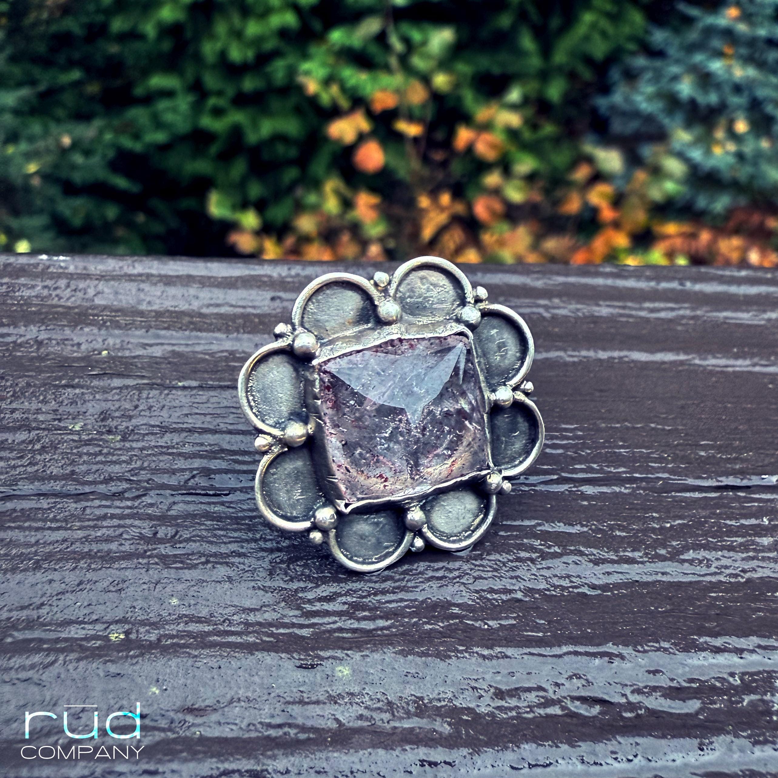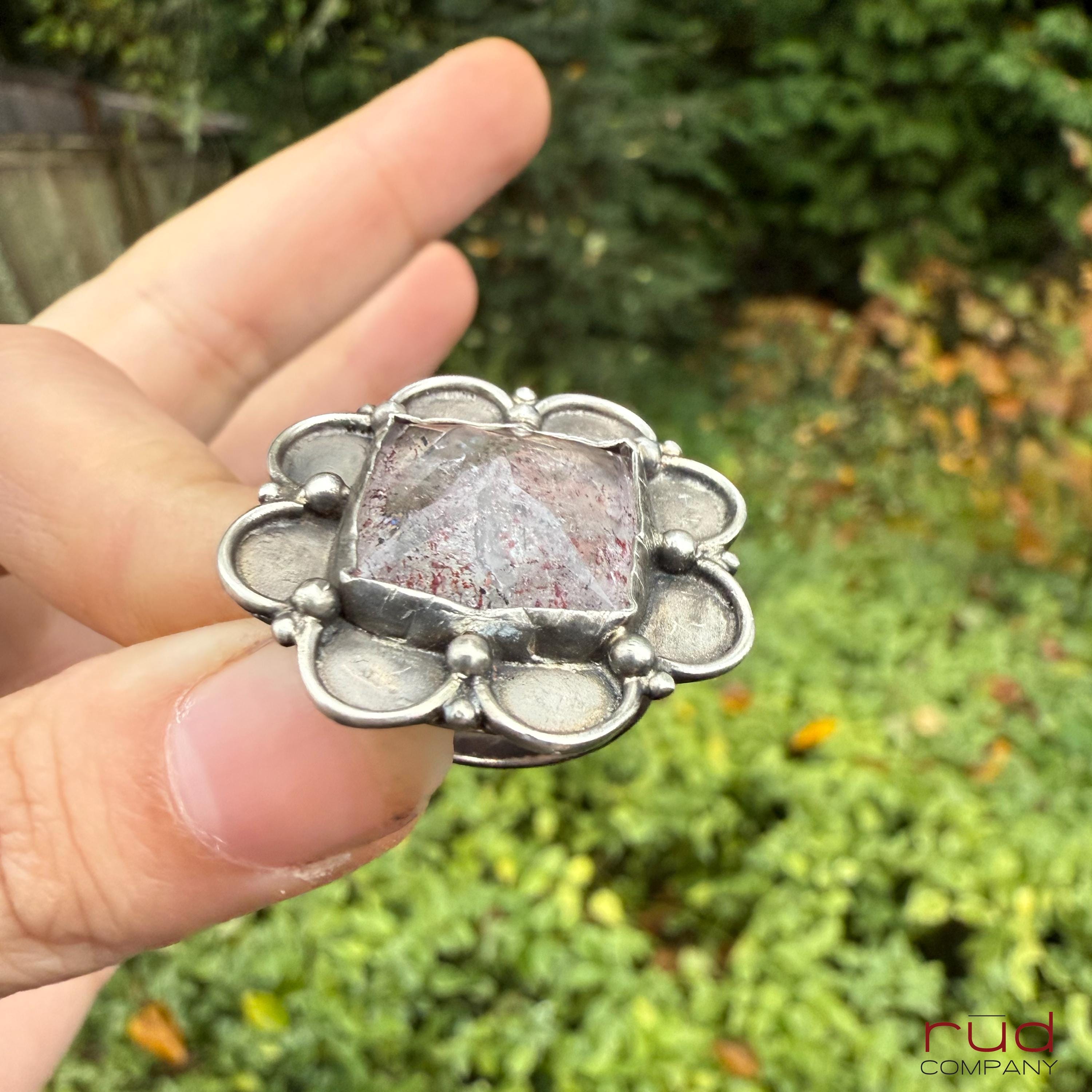 Seventh Element - Super Seven / Cacoxenite /Melody Stone Cabochon Ring artisan Sterling Silver Cocktail Ring, Square Rustic Petals Size 8