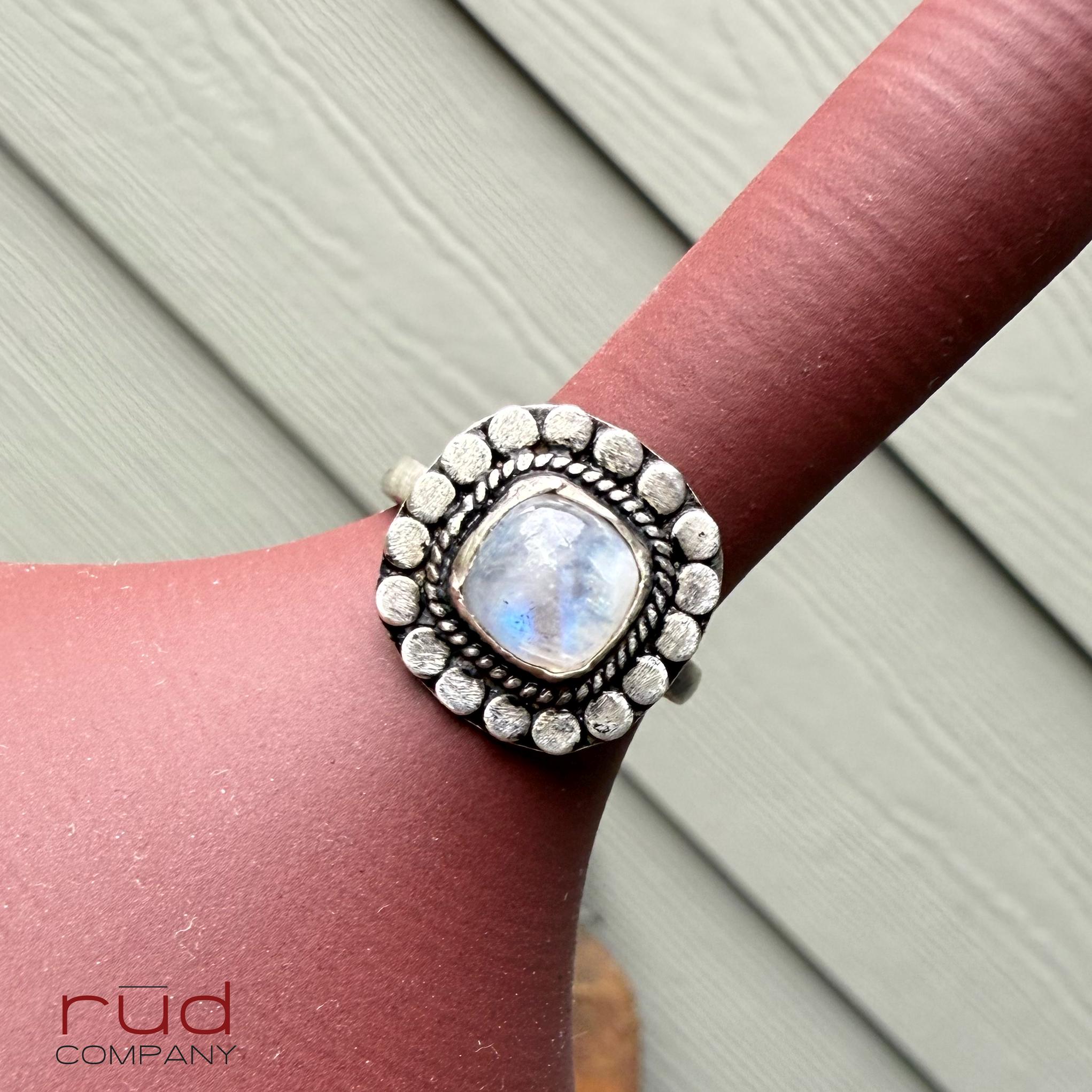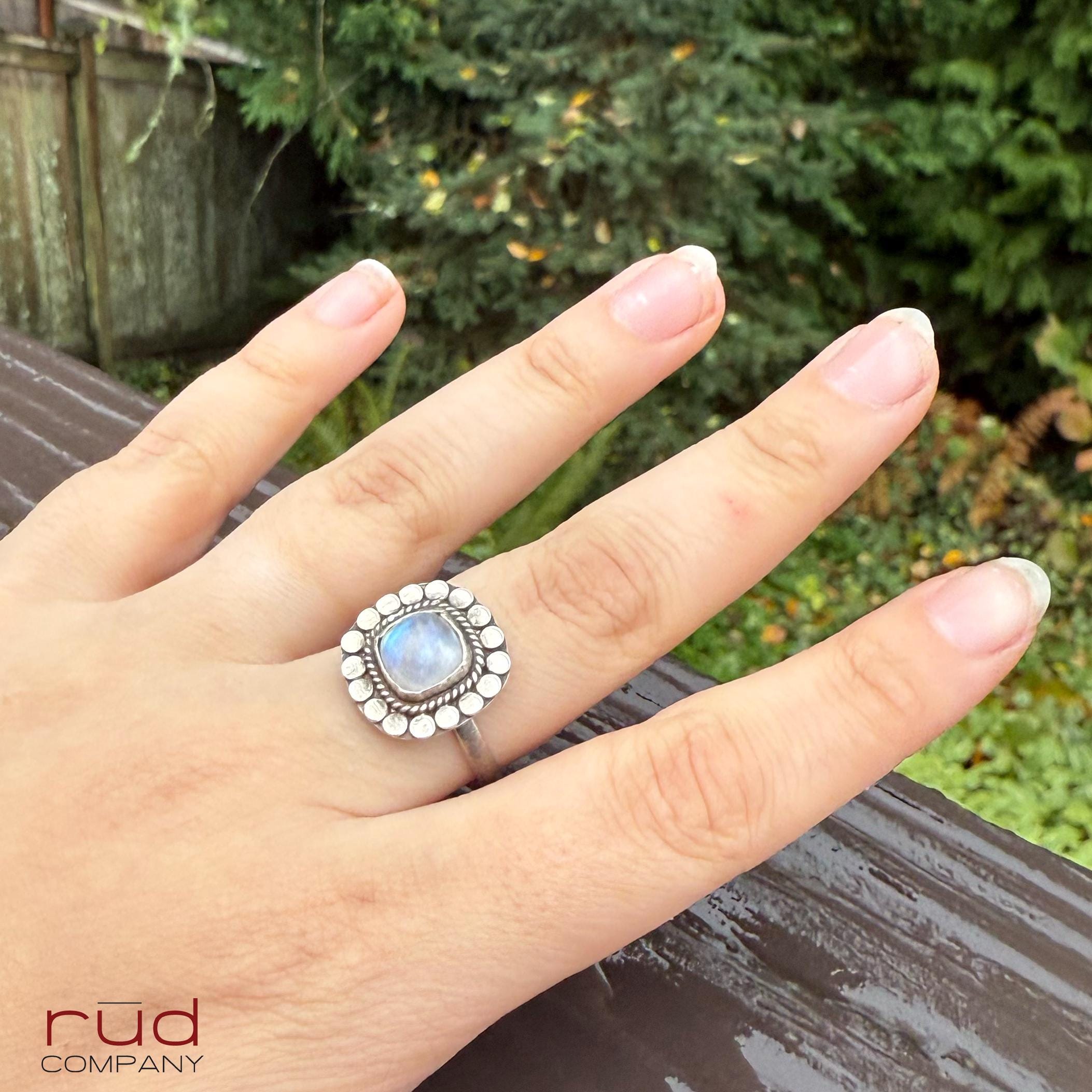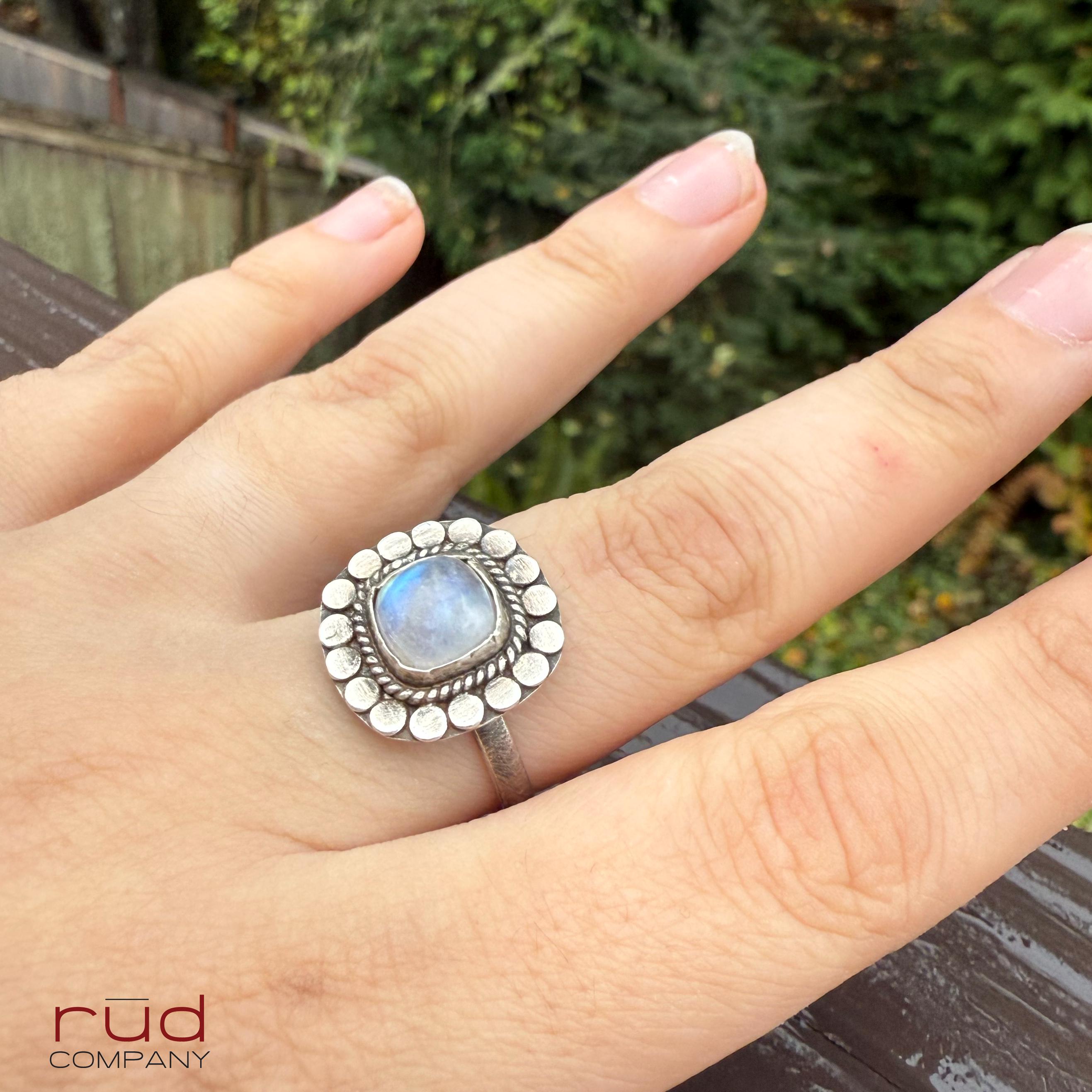 Luna Halo - Blue Flash Moonstone Cabochon Ring artisan Sterling Silver Cocktail Ring Ornate Detail Stone Sz 9