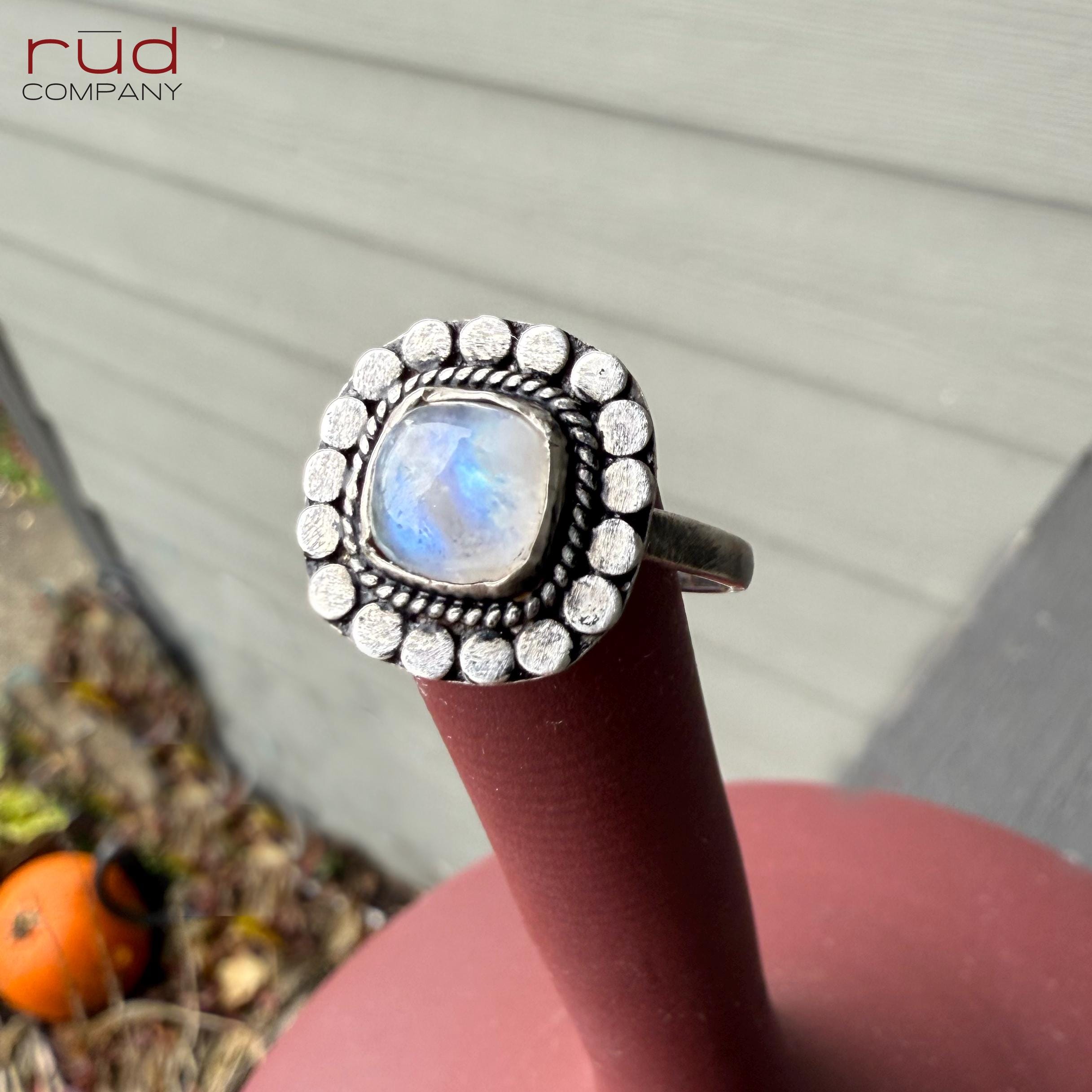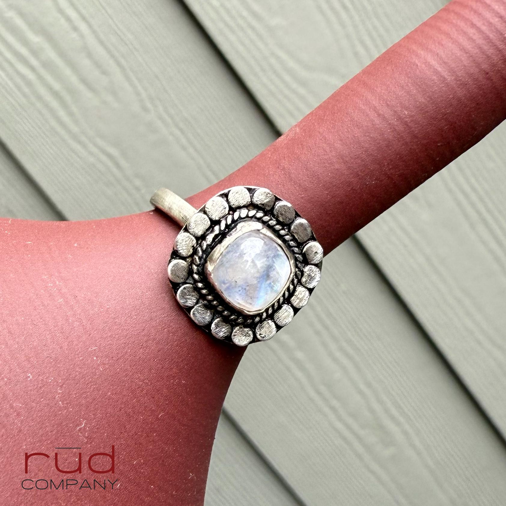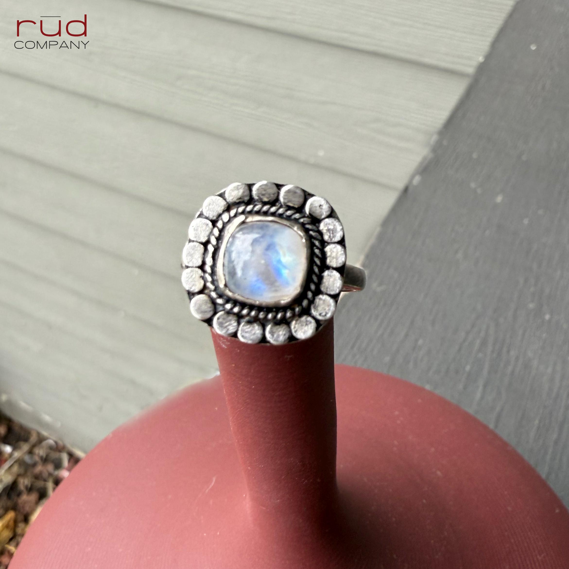 Luna Halo - Blue Flash Moonstone Cabochon Ring artisan Sterling Silver Cocktail Ring Ornate Detail Stone Sz 9