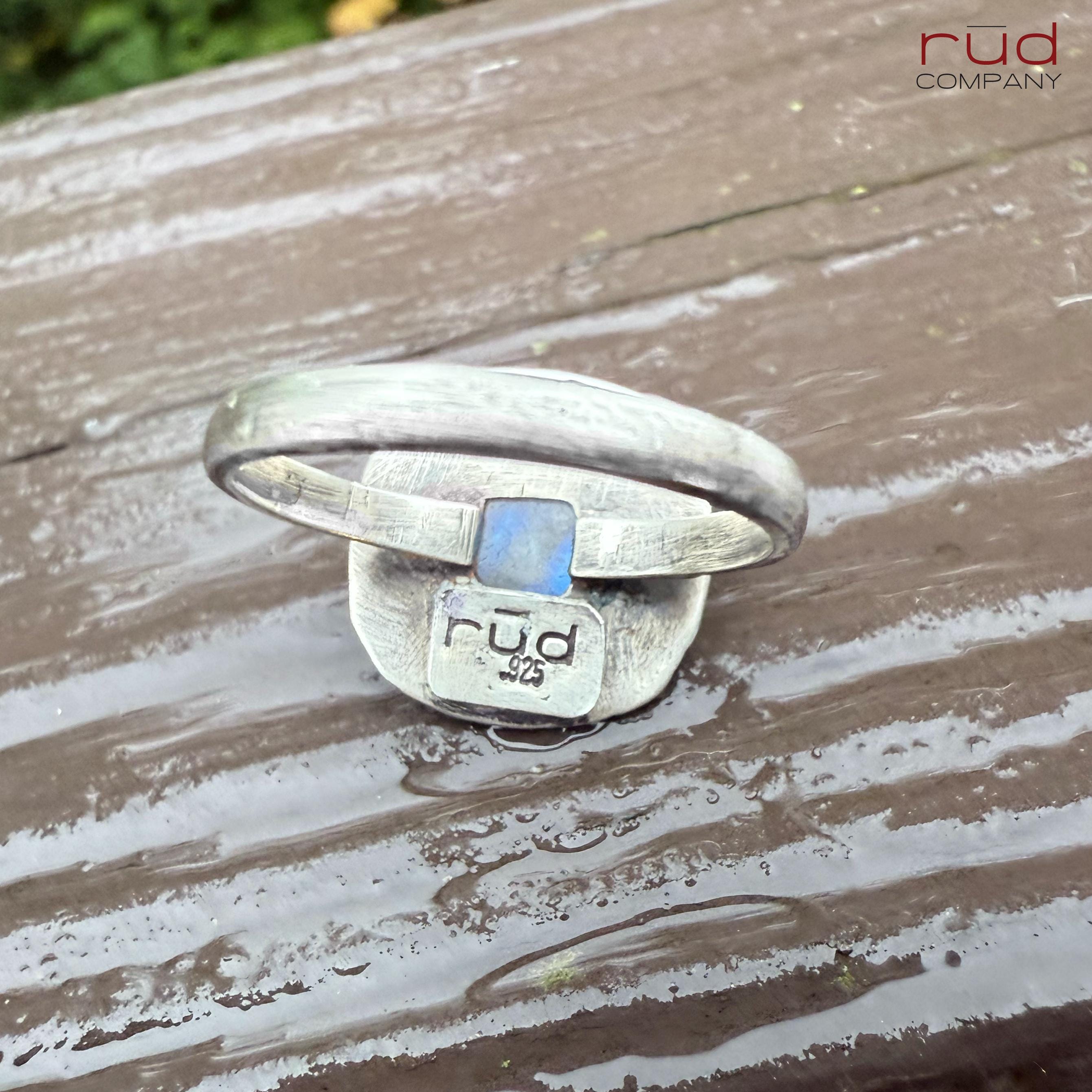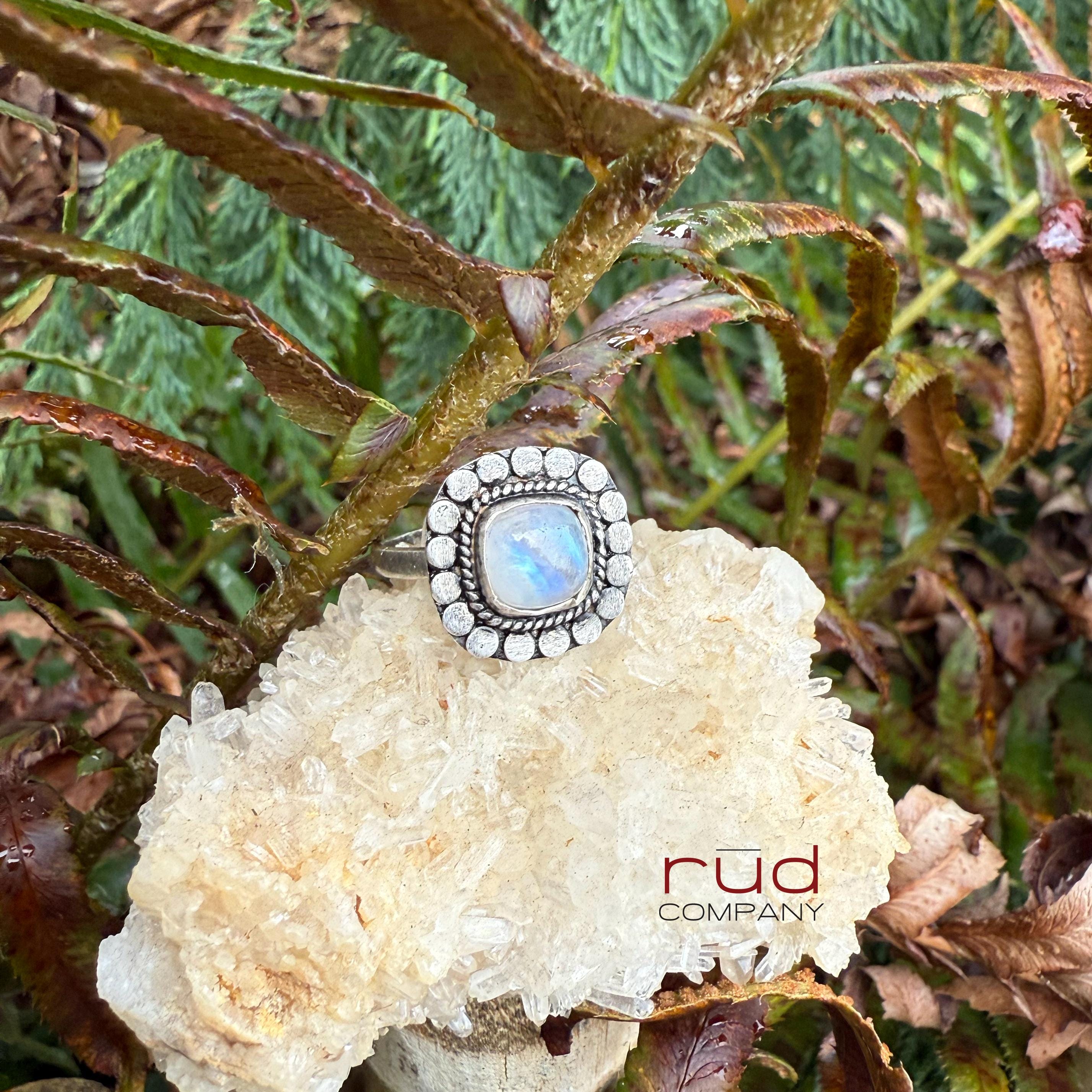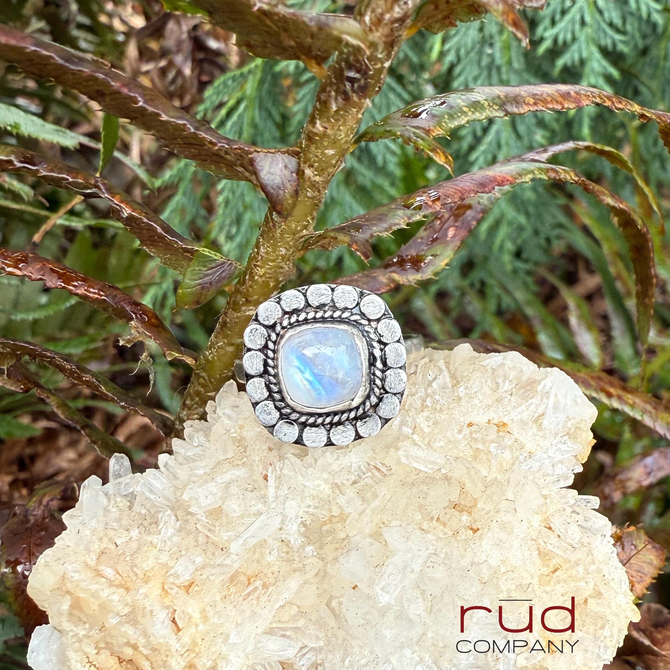 This lovely handcrafted, one of a kind solid sterling silver ring is set with an exquisite, expertly cut and polished Moonstone with blue flash cabochon. Excellent quality and color in this stone. I have set it within a "crown" of little flattened sterling dots.