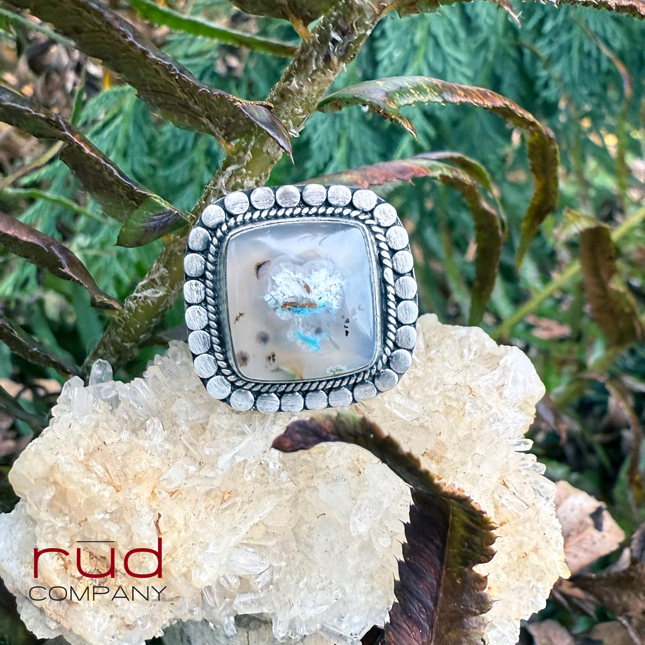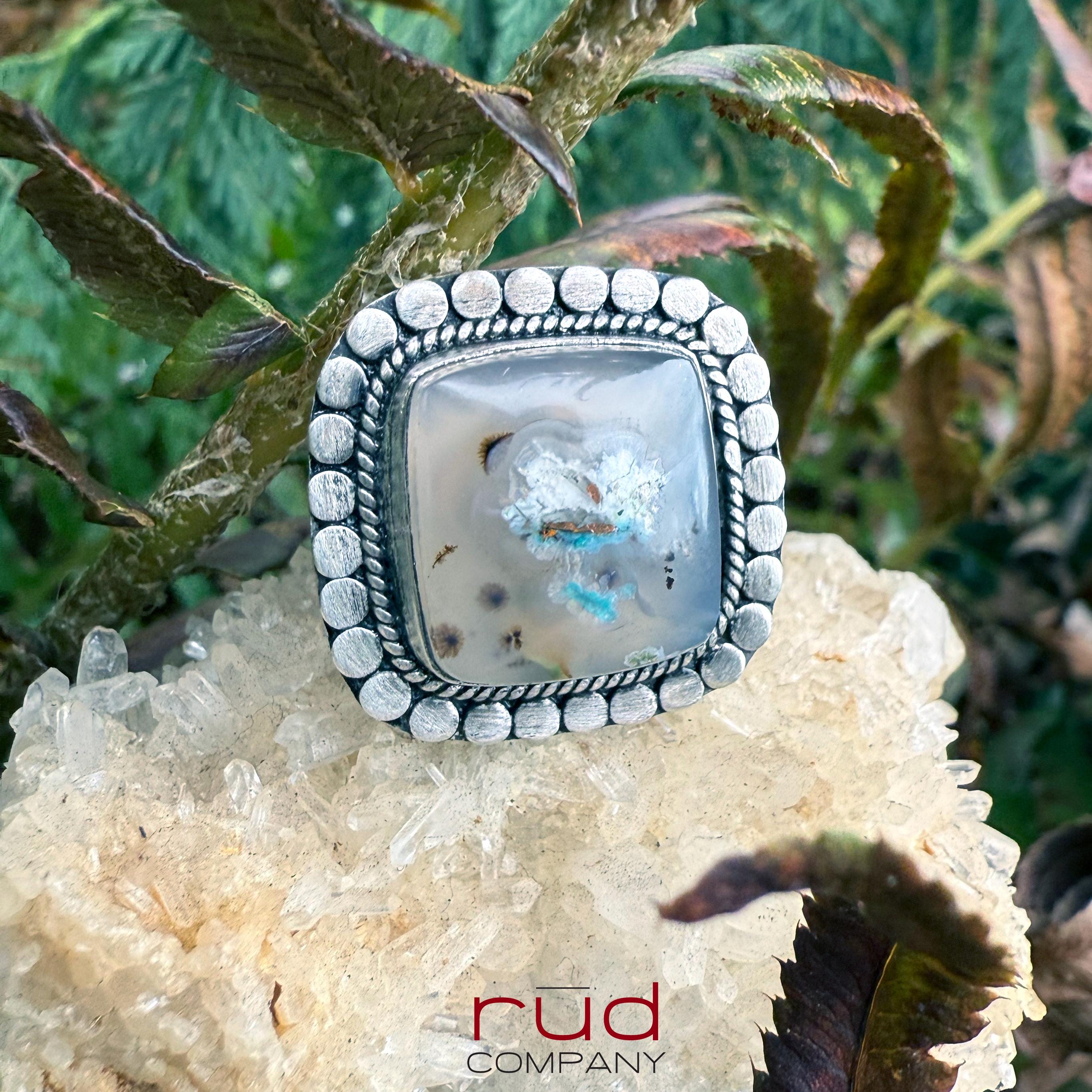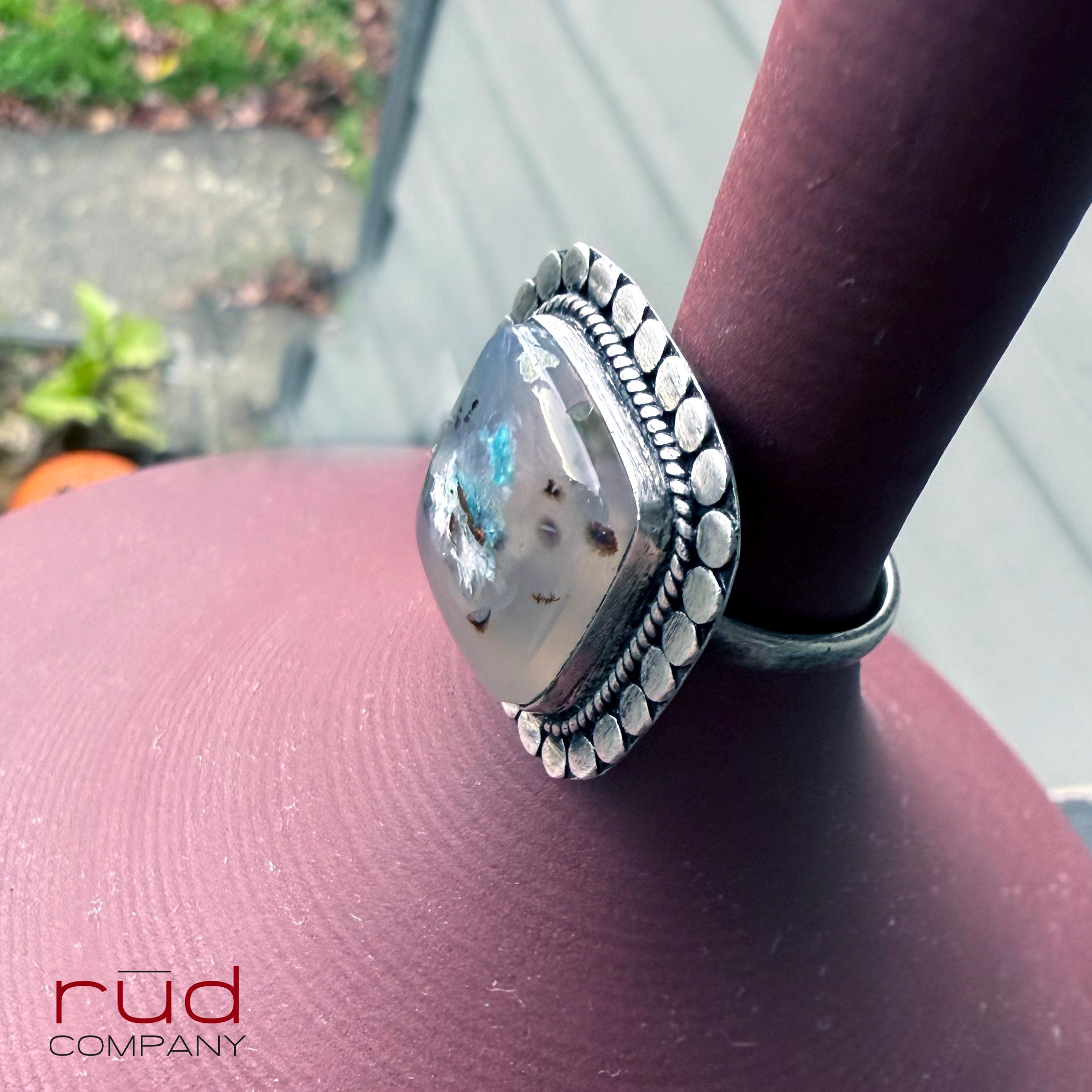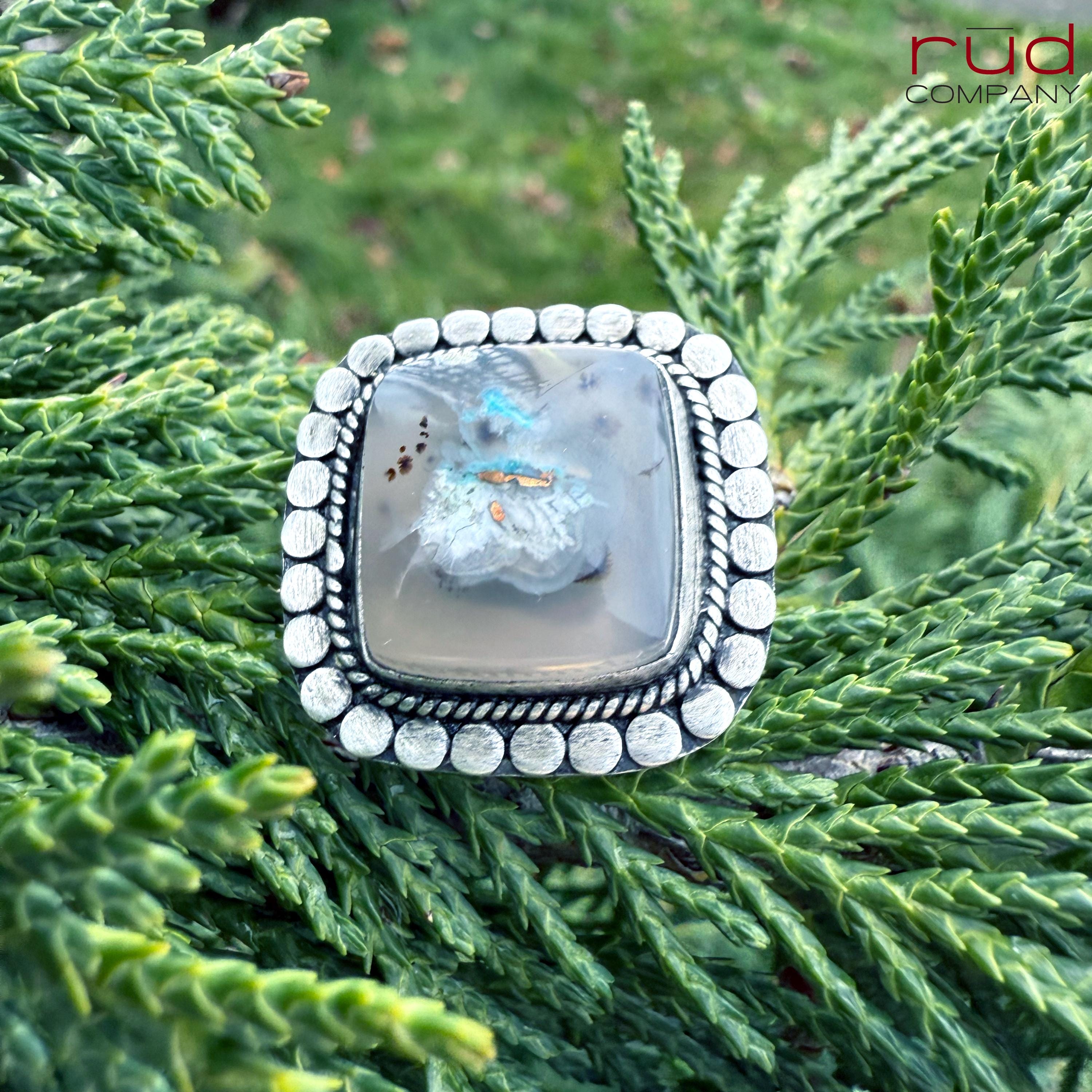 Copper Sky- Native Copper Chrysocolla in Chalcedony Cabochon Ring artisan set in Sterling Silver Cocktail Ring Dotted Style Size 9.25 Square