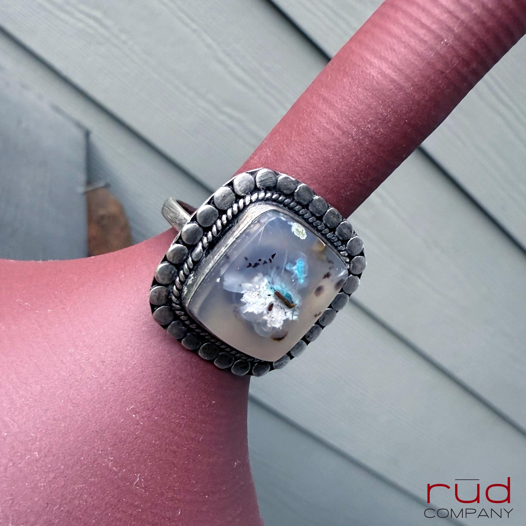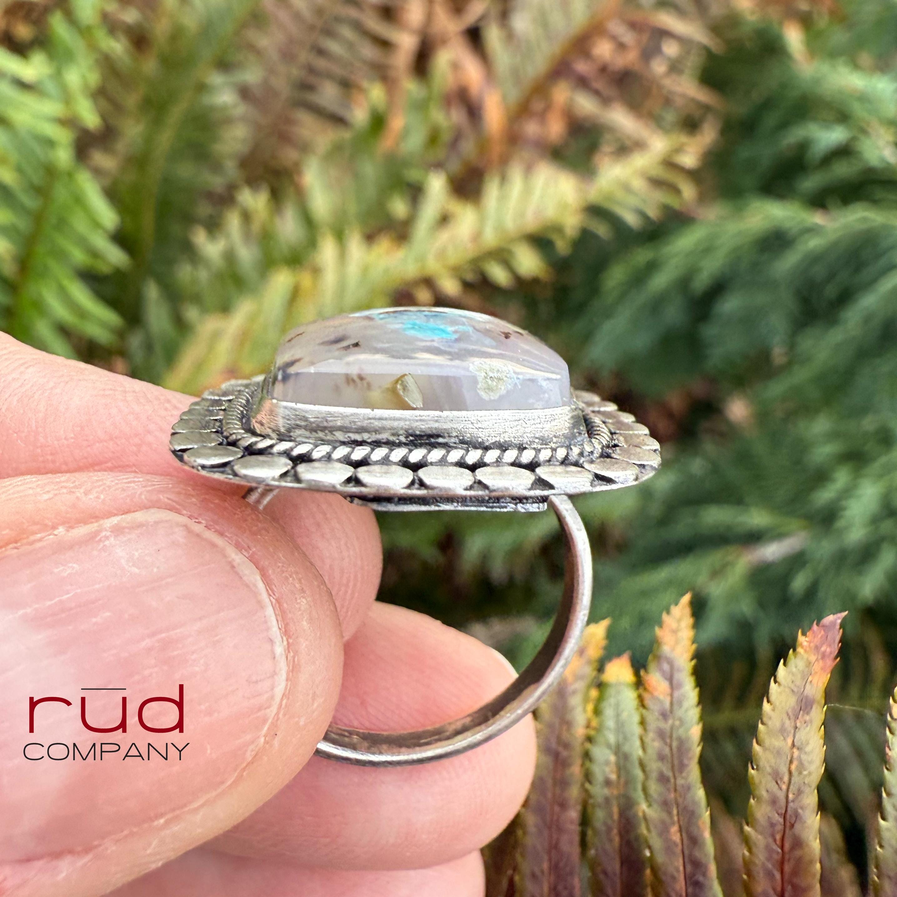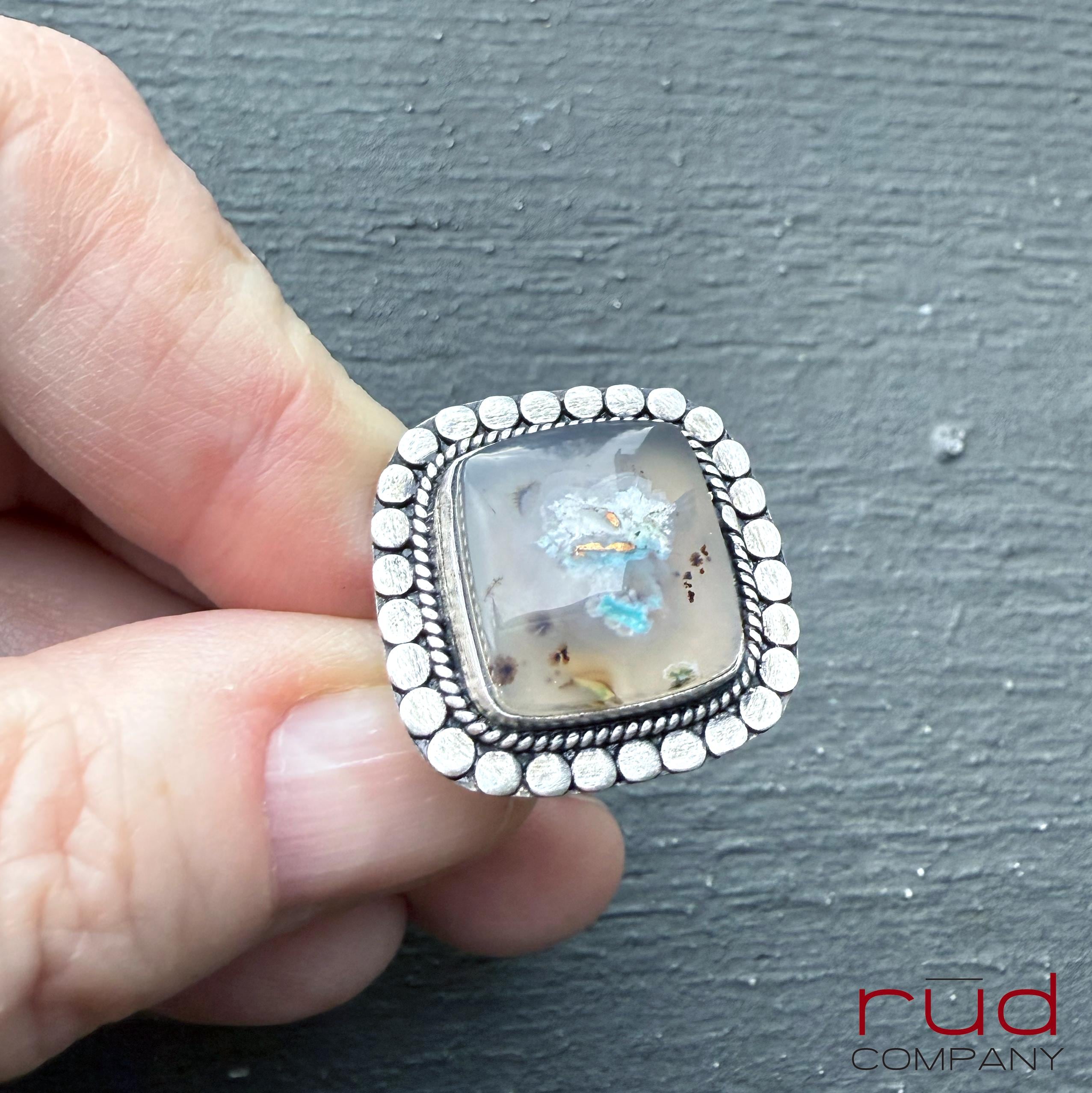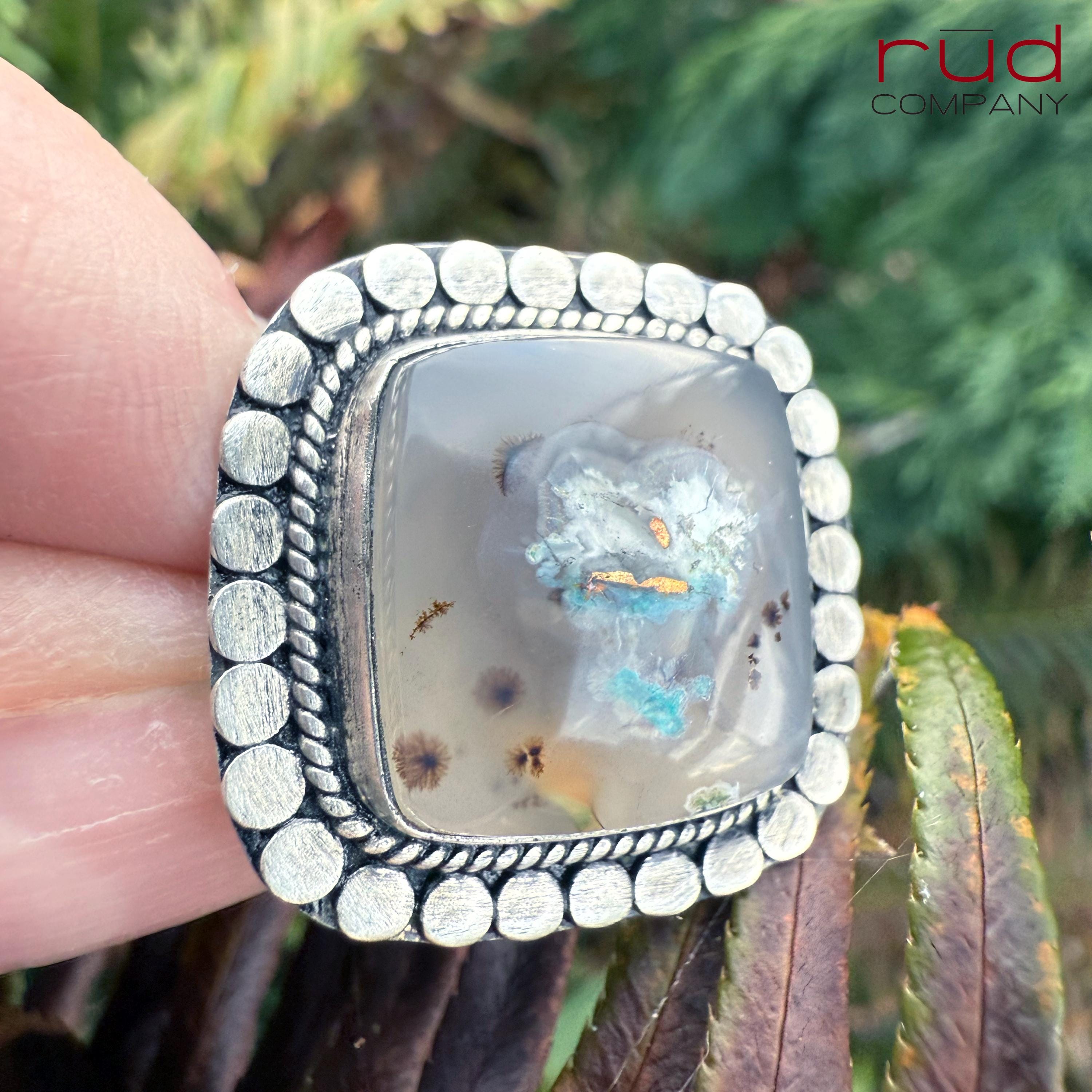 Copper Sky- Native Copper Chrysocolla in Chalcedony Cabochon Ring artisan set in Sterling Silver Cocktail Ring Dotted Style Size 9.25 Square