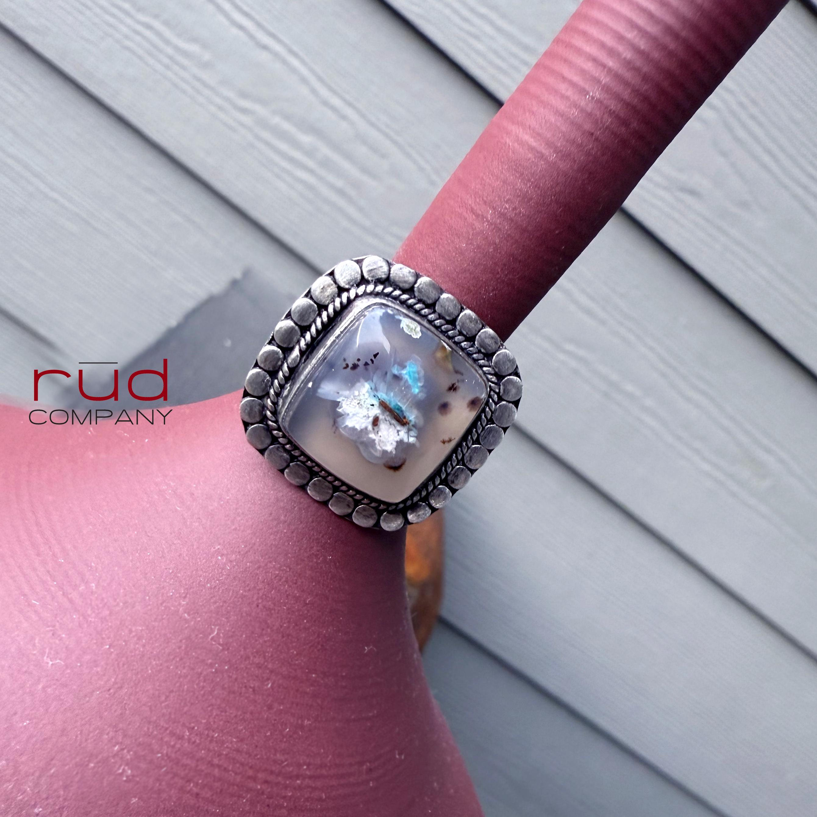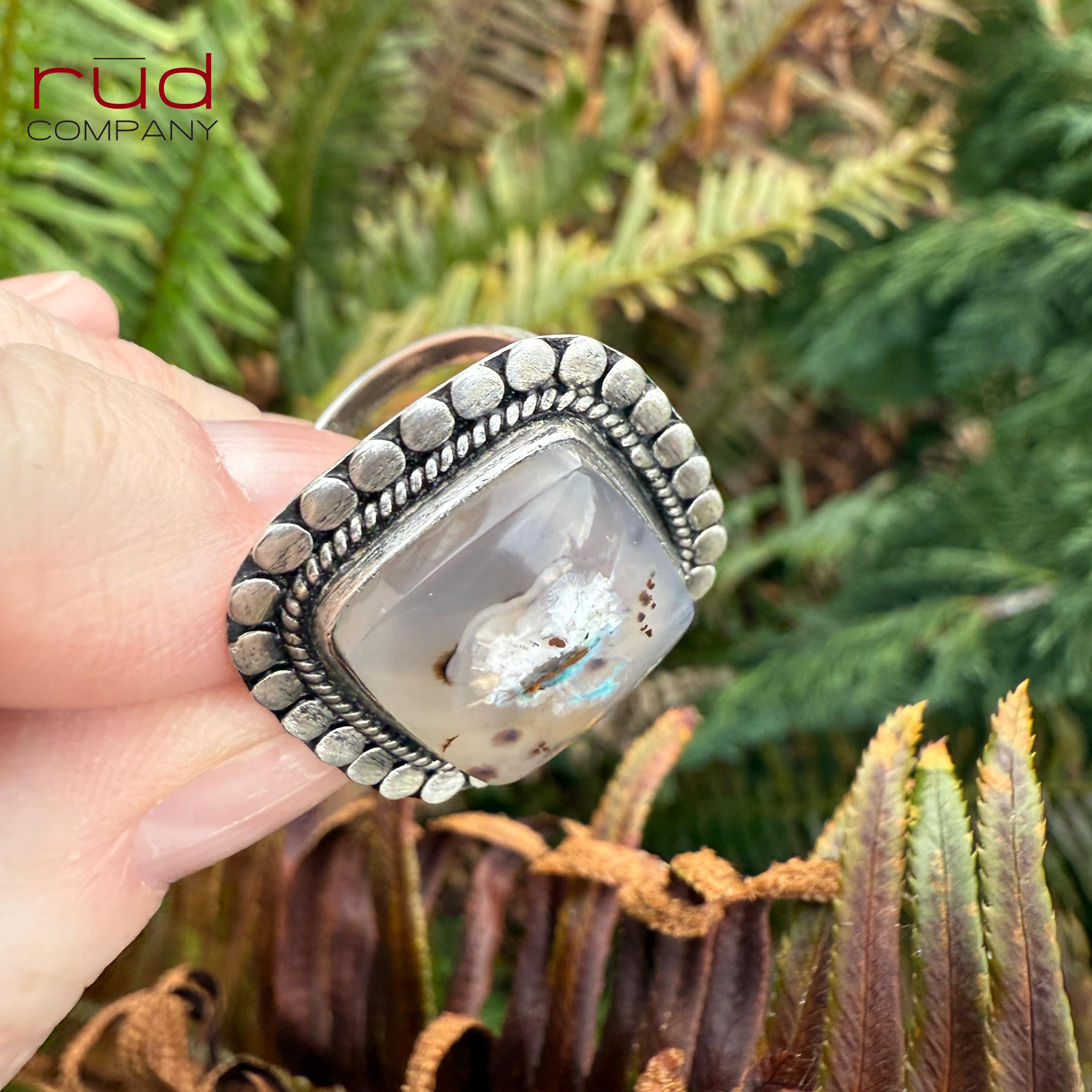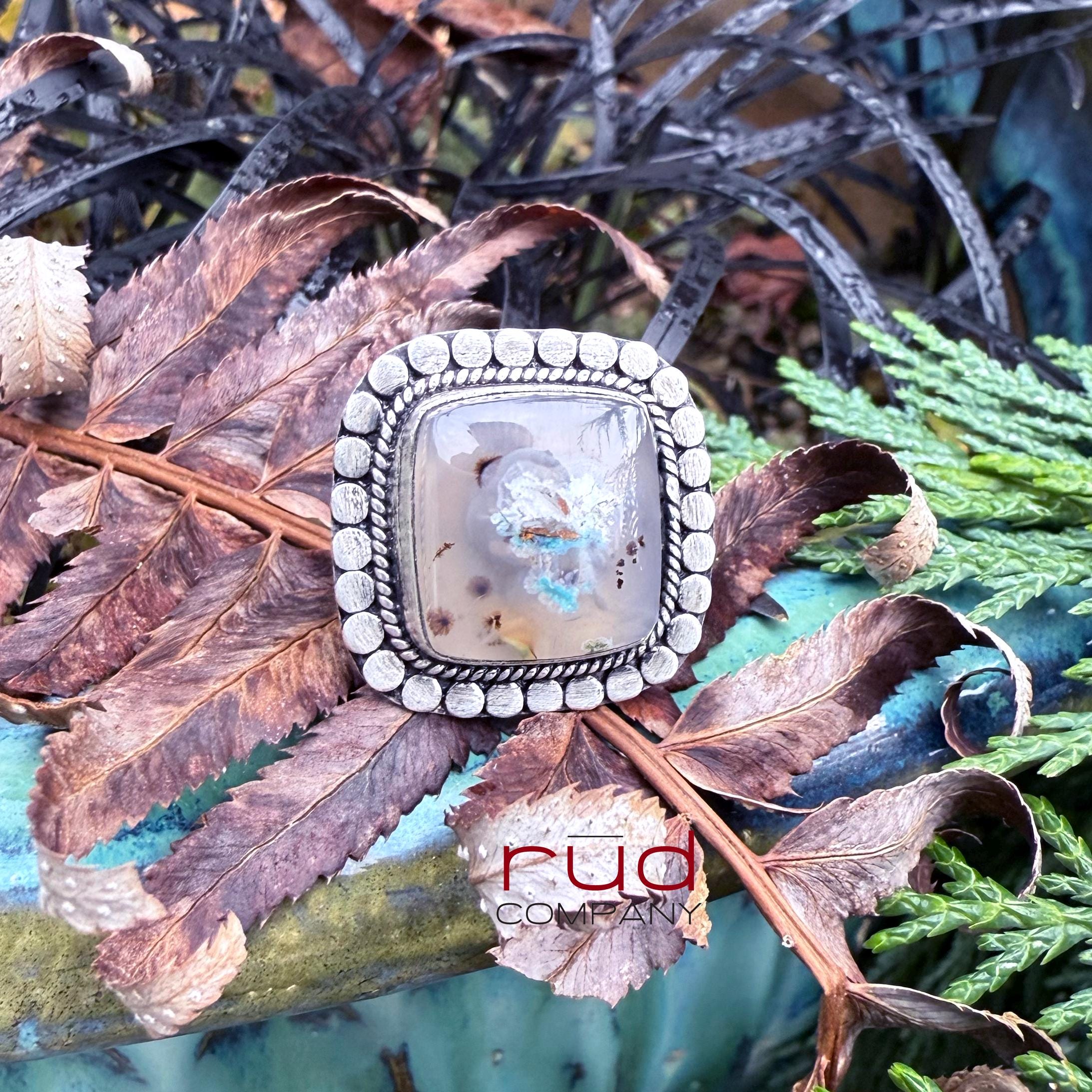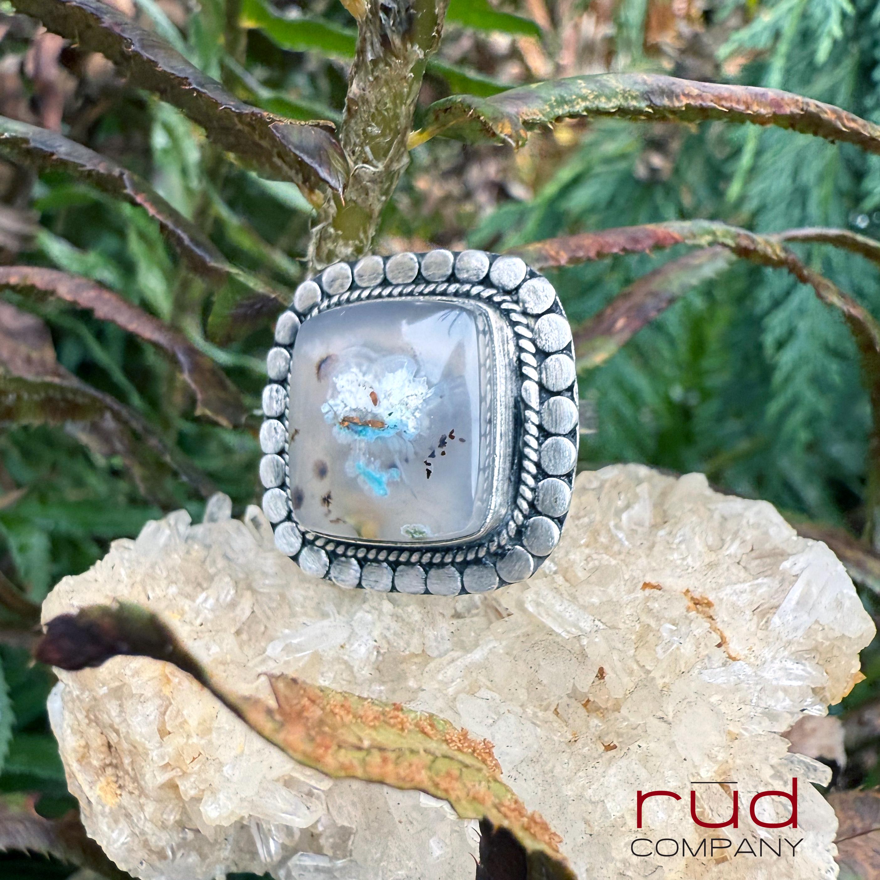 Copper Sky- Native Copper Chrysocolla in Chalcedony Cabochon Ring artisan set in Sterling Silver Cocktail Ring Dotted Style Size 9.25 Square