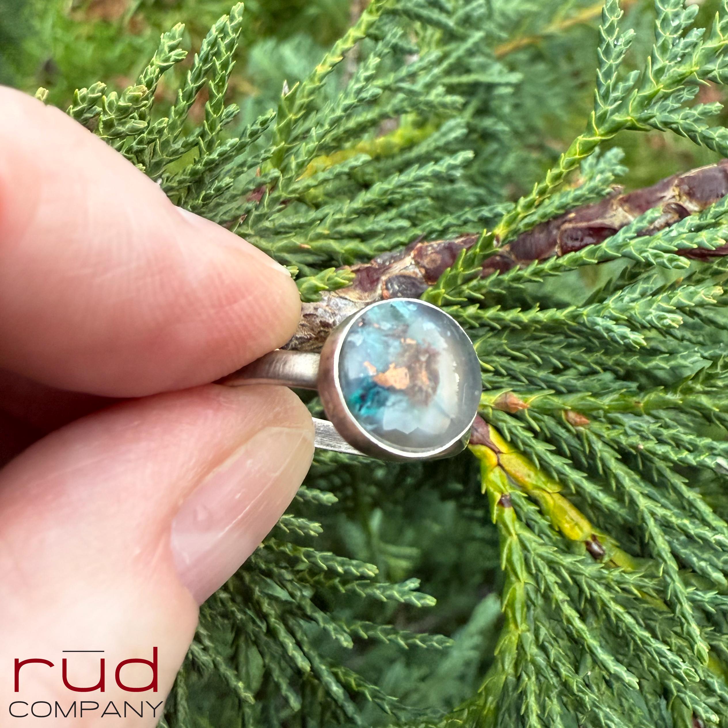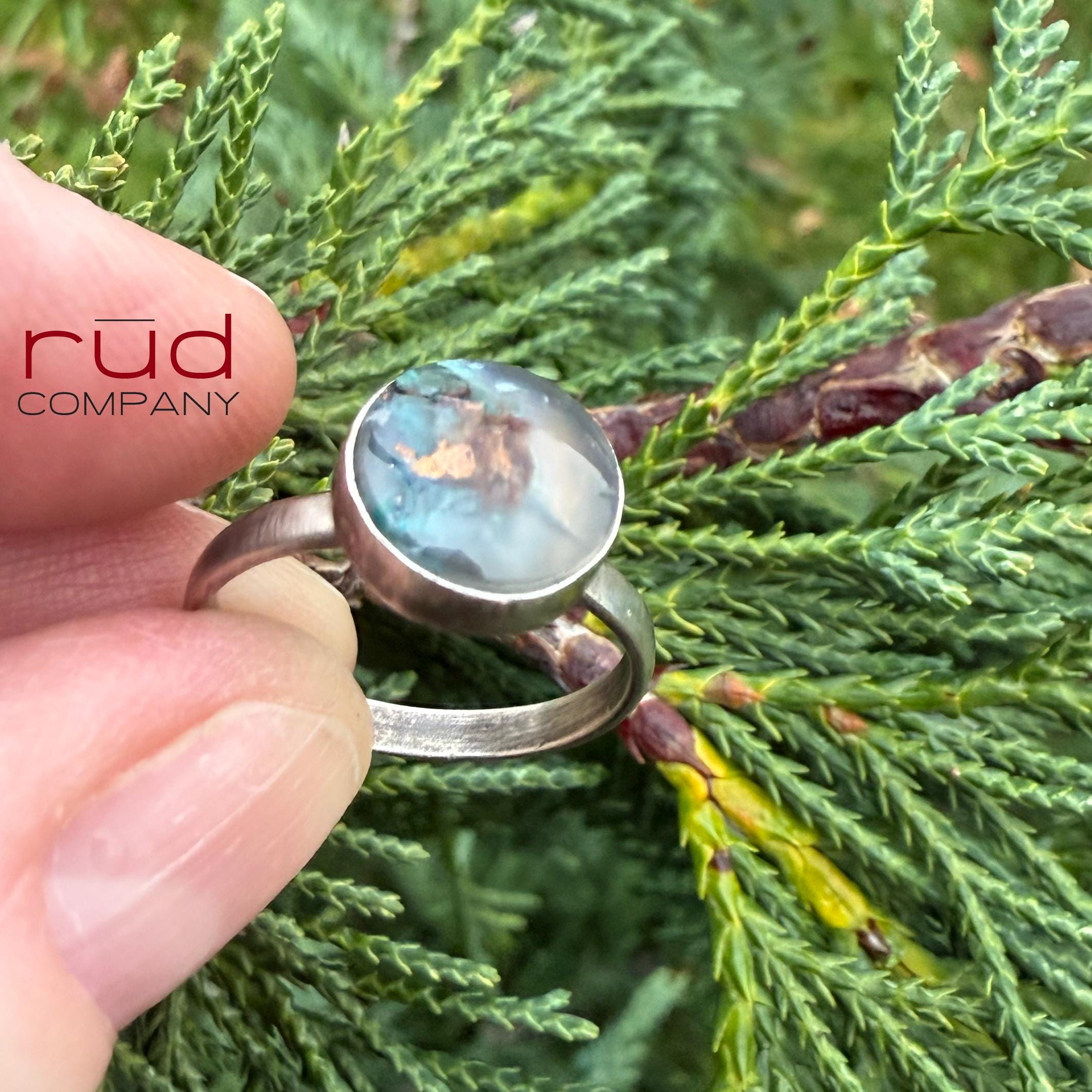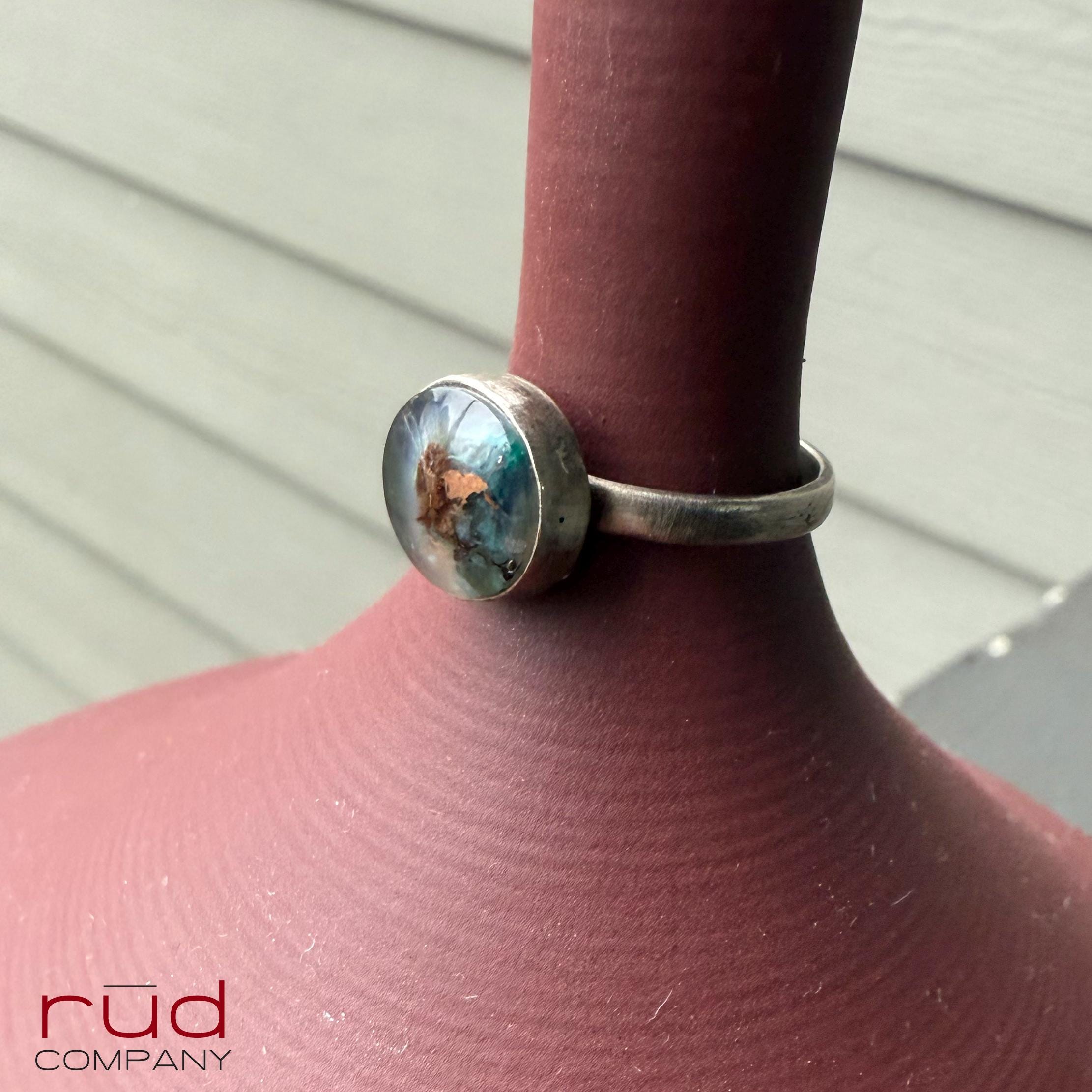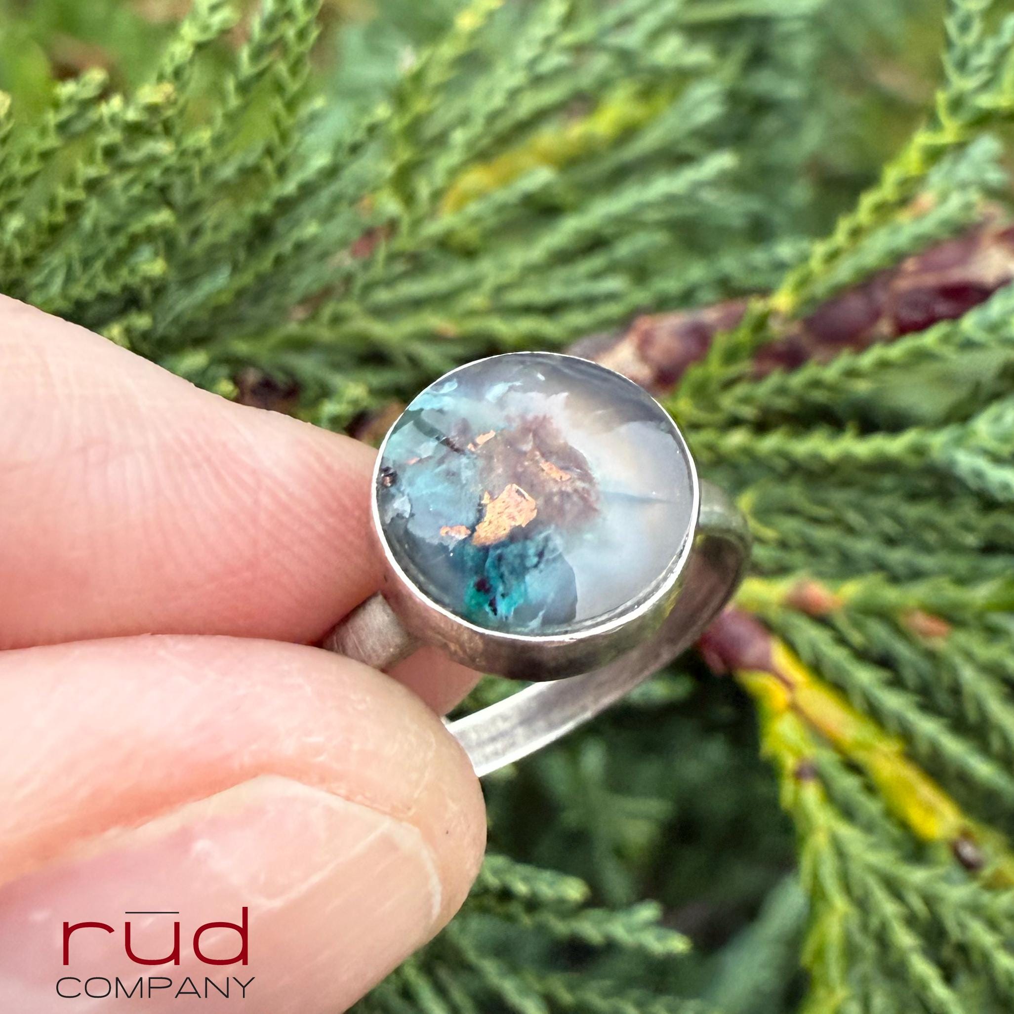This piece has a quiet, ethereal beauty — the soft chalcedony, the turquoise-blue chrysocolla, and the flashes of native copper feel like a hidden world suspended in mist. Minimal elegance... one of a kind solid sterling silver ring is set with an exquisite, expertly cut and polished Native Copper Chrysocolla Chalcedony cabochon. You can see the actual flakes of copper, shining. It's so smooth that it's hard not to touch it :). It will garner compliments everywhere you go - and there will never be another one just like it.