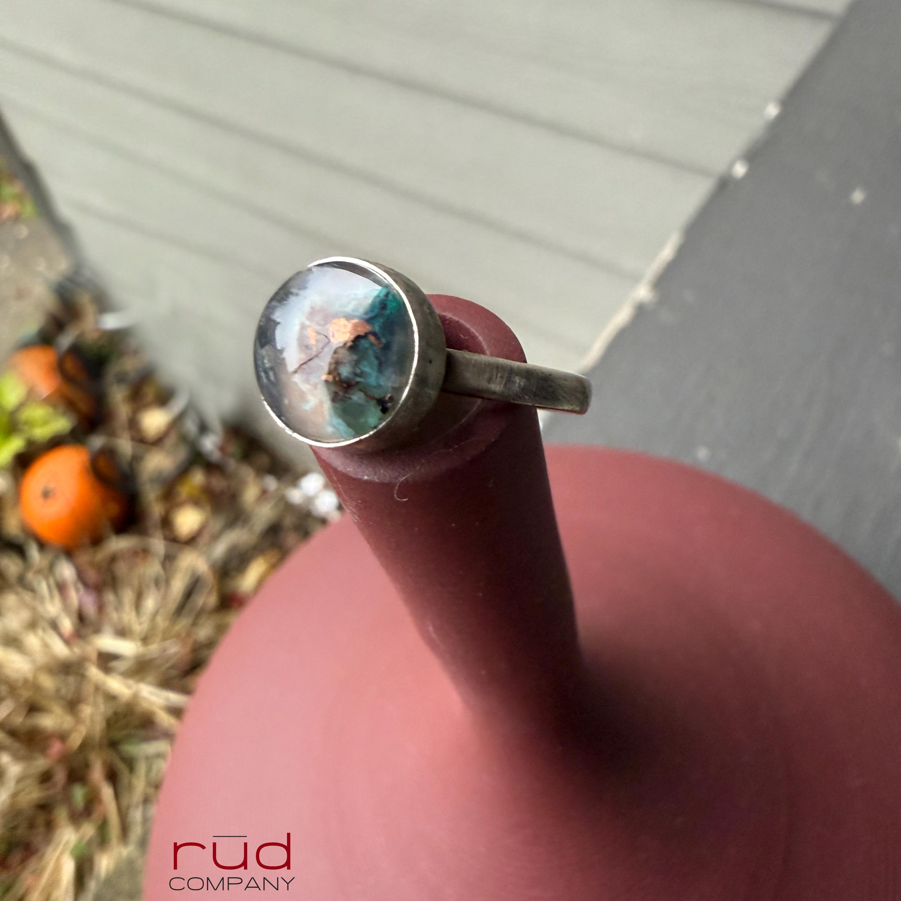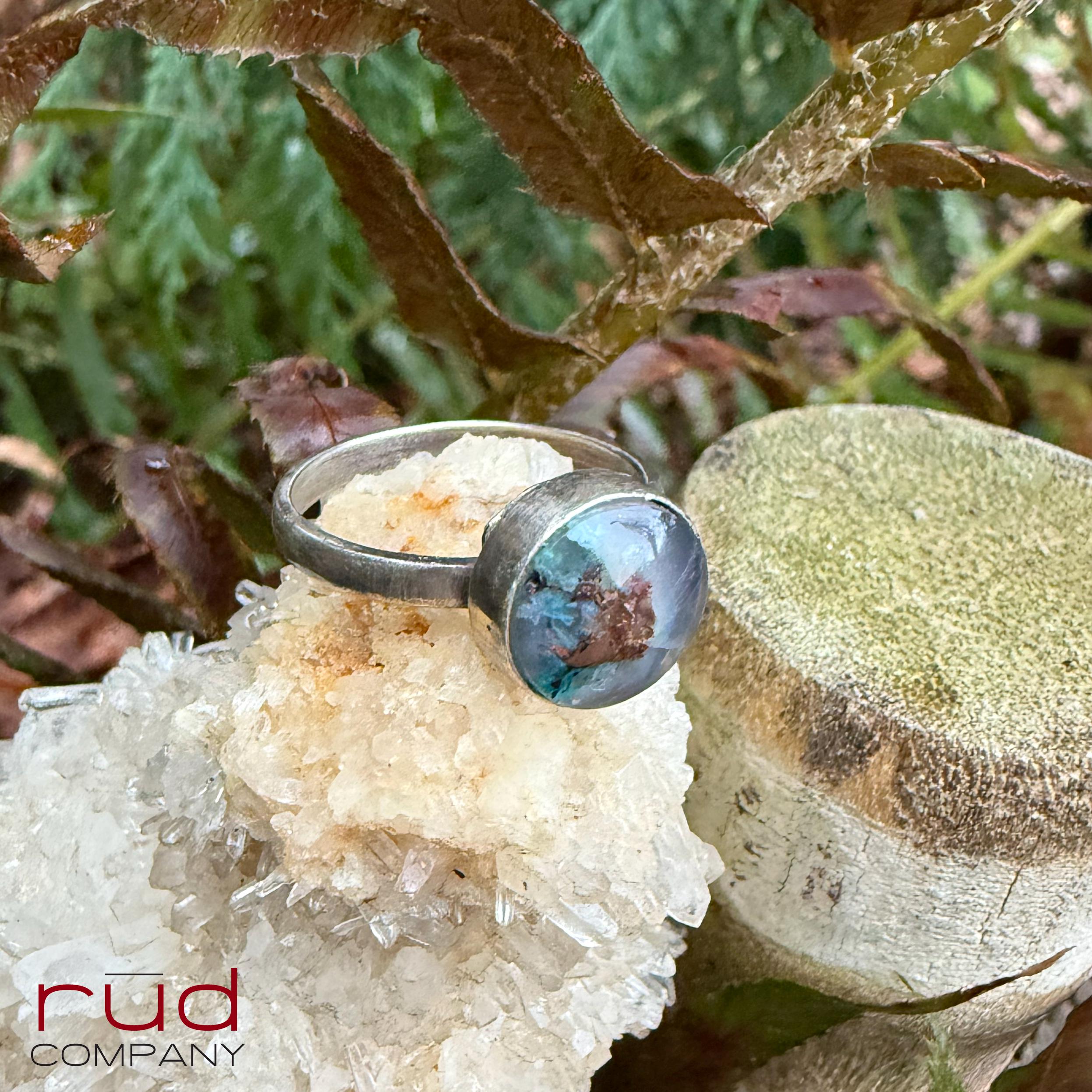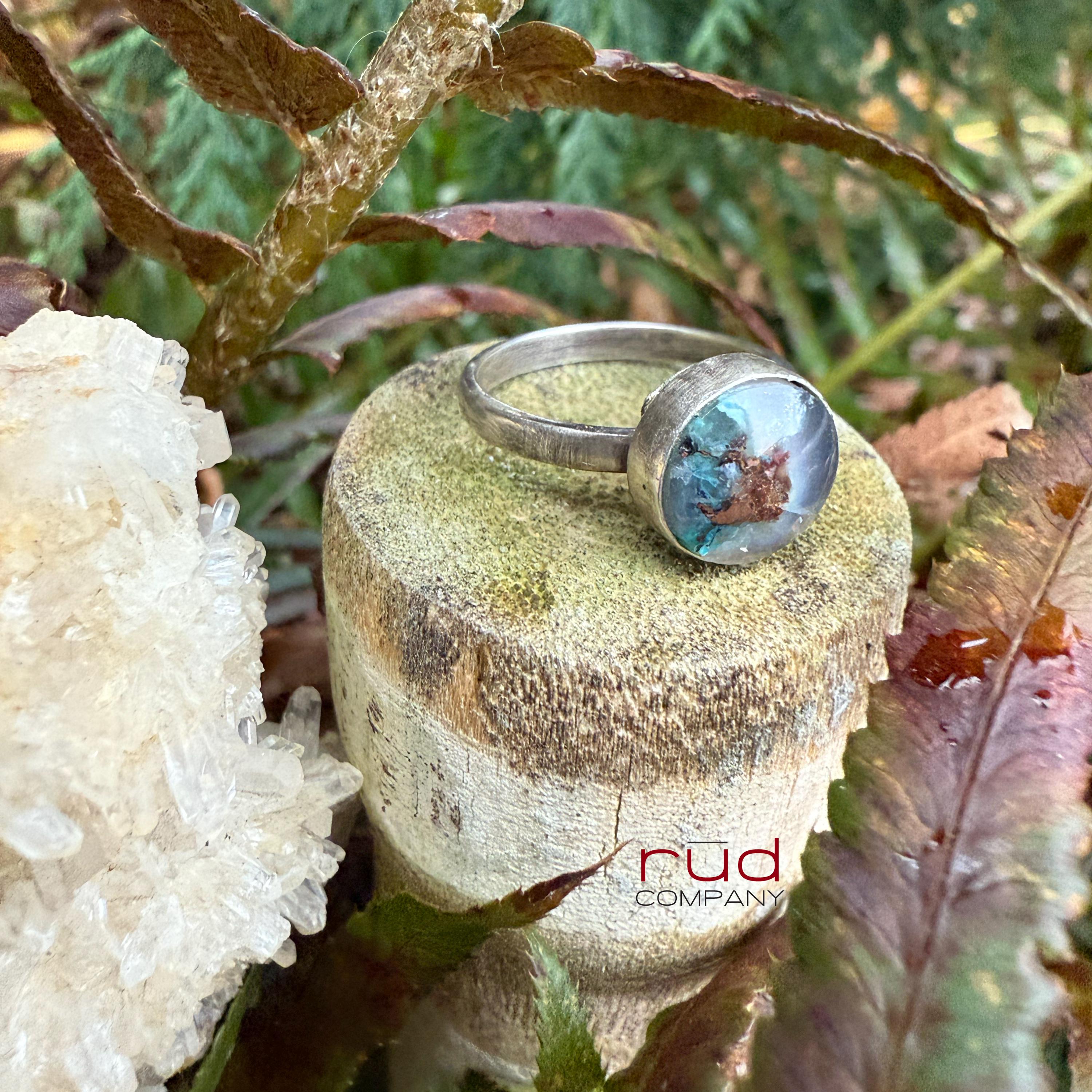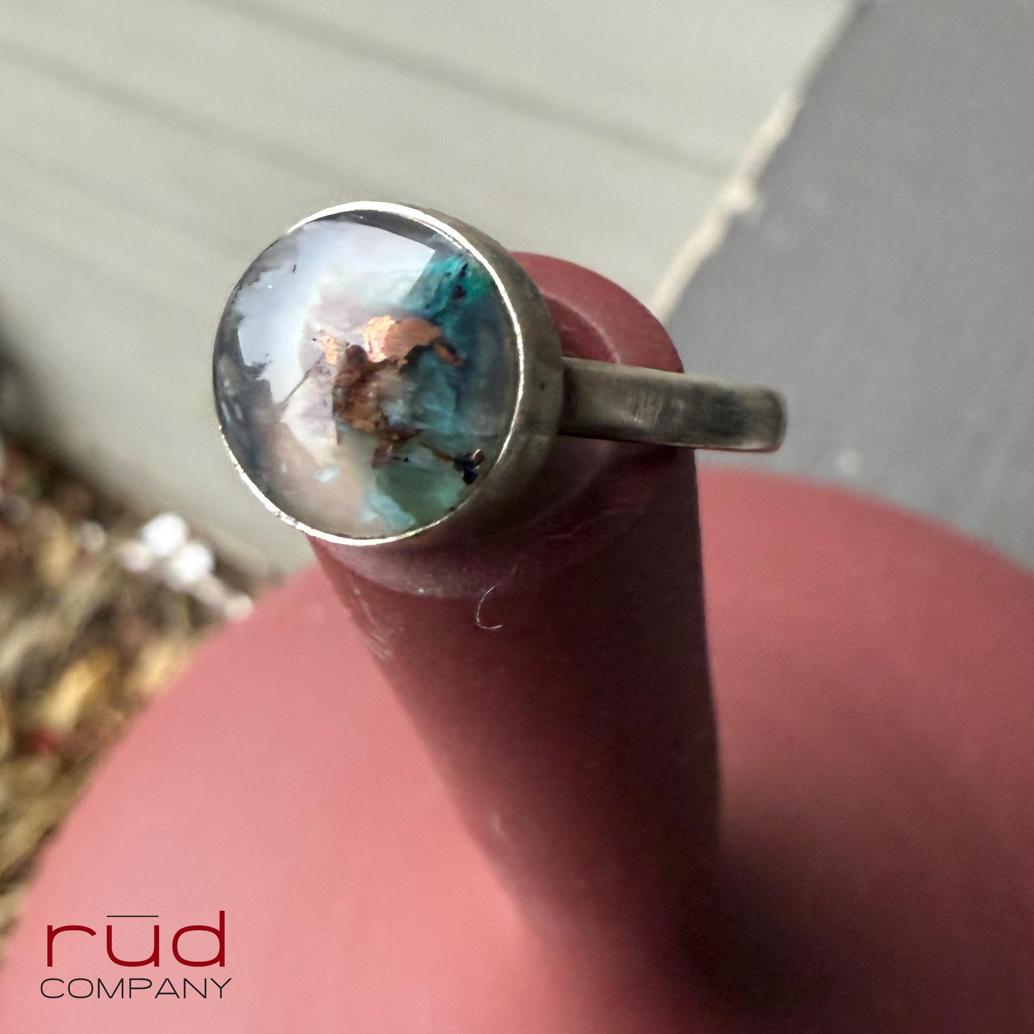 Hidden World - Native Copper Chrysocolla in Chalcedony Cabochon Ring artisan set in Sterling Silver Cocktail Ring Minimalist Style Size 8.25