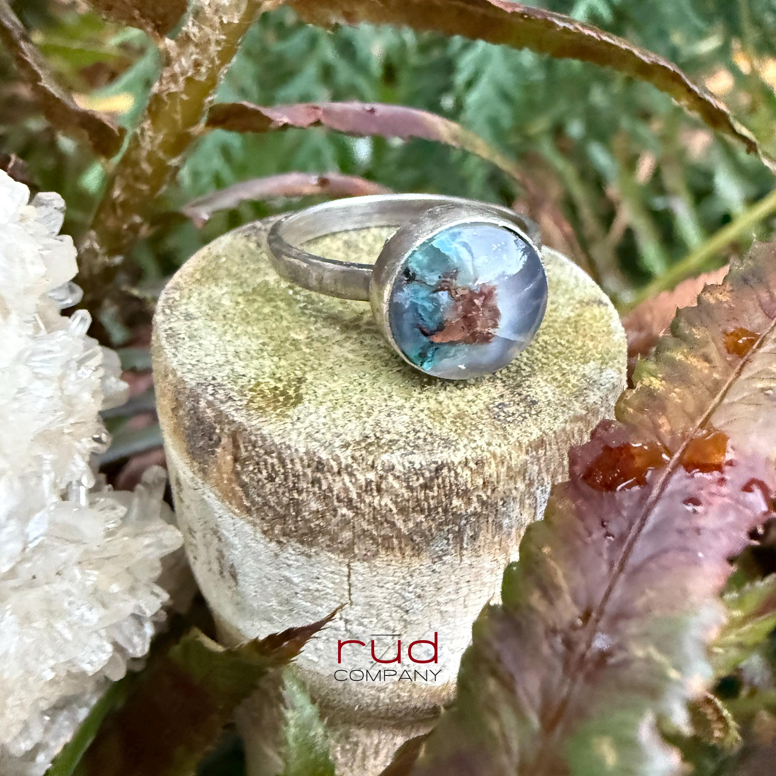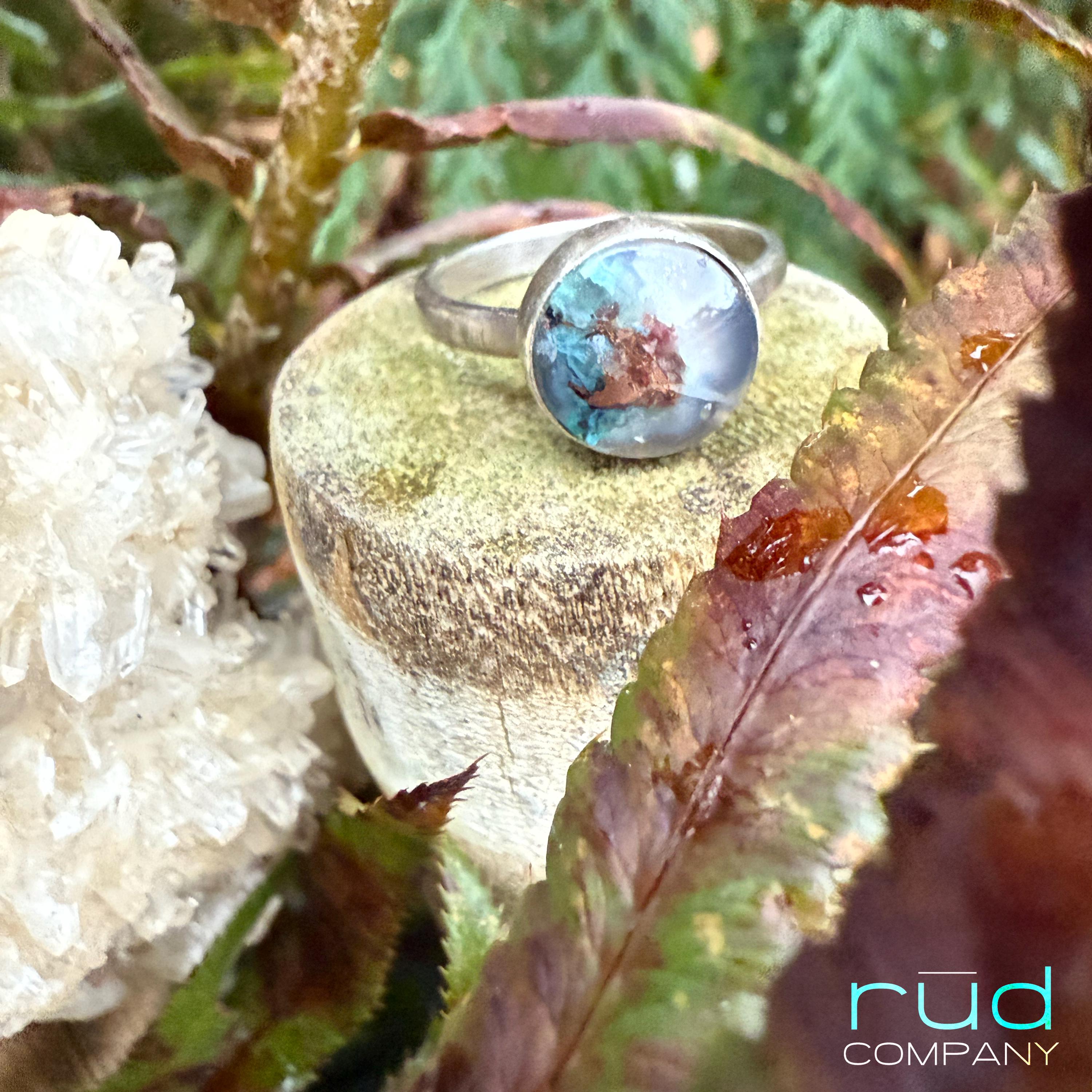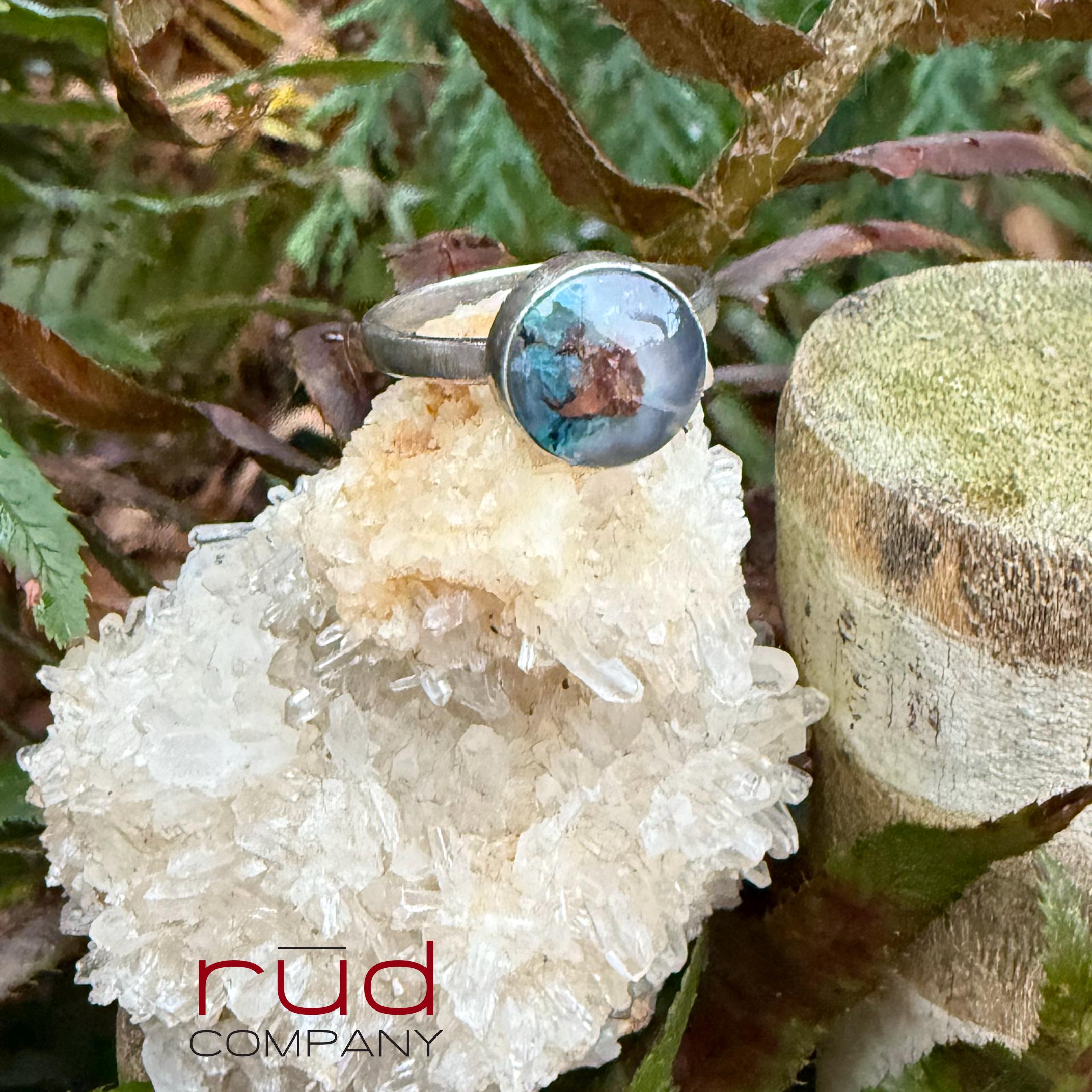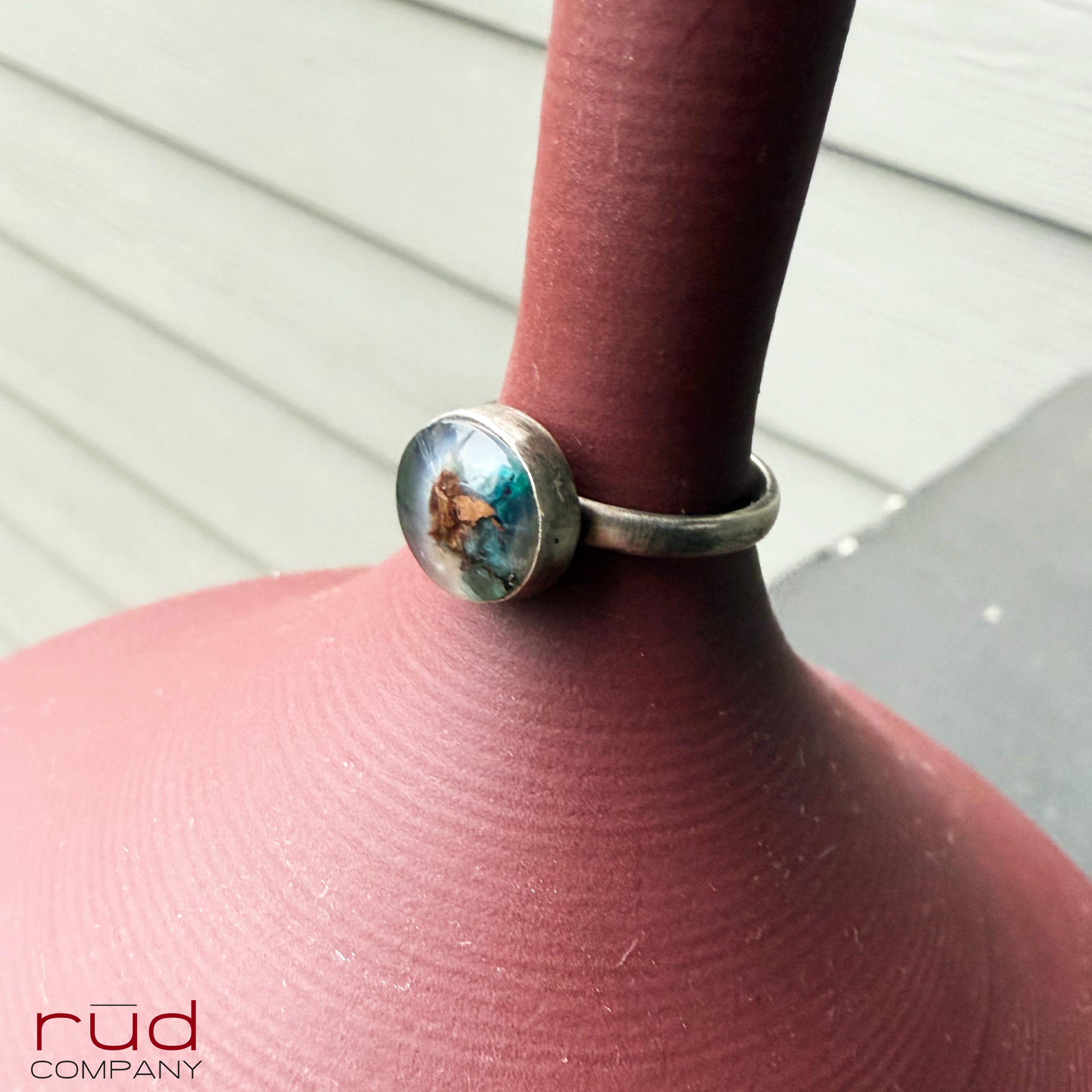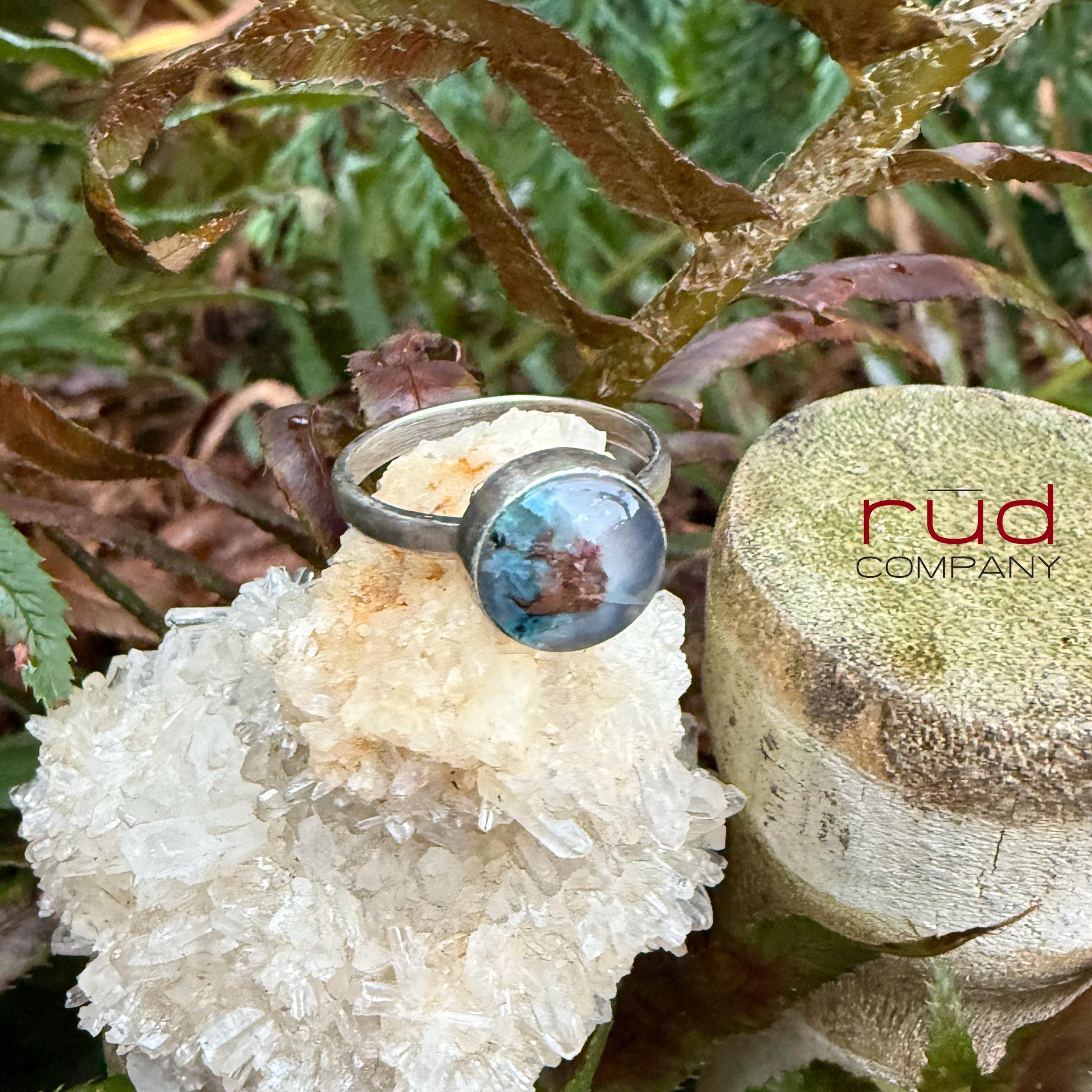 Hidden World - Native Copper Chrysocolla in Chalcedony Cabochon Ring artisan set in Sterling Silver Cocktail Ring Minimalist Style Size 8.25