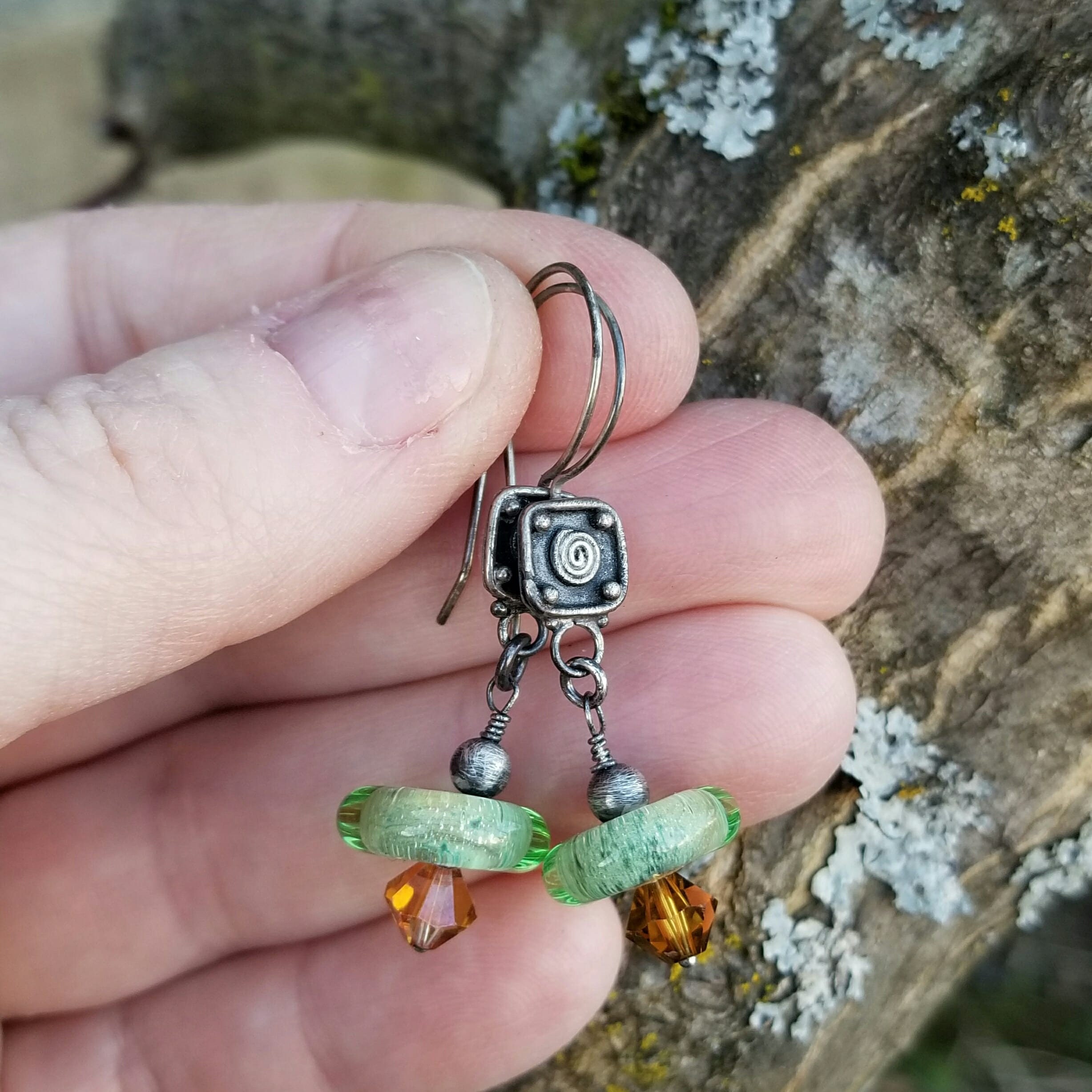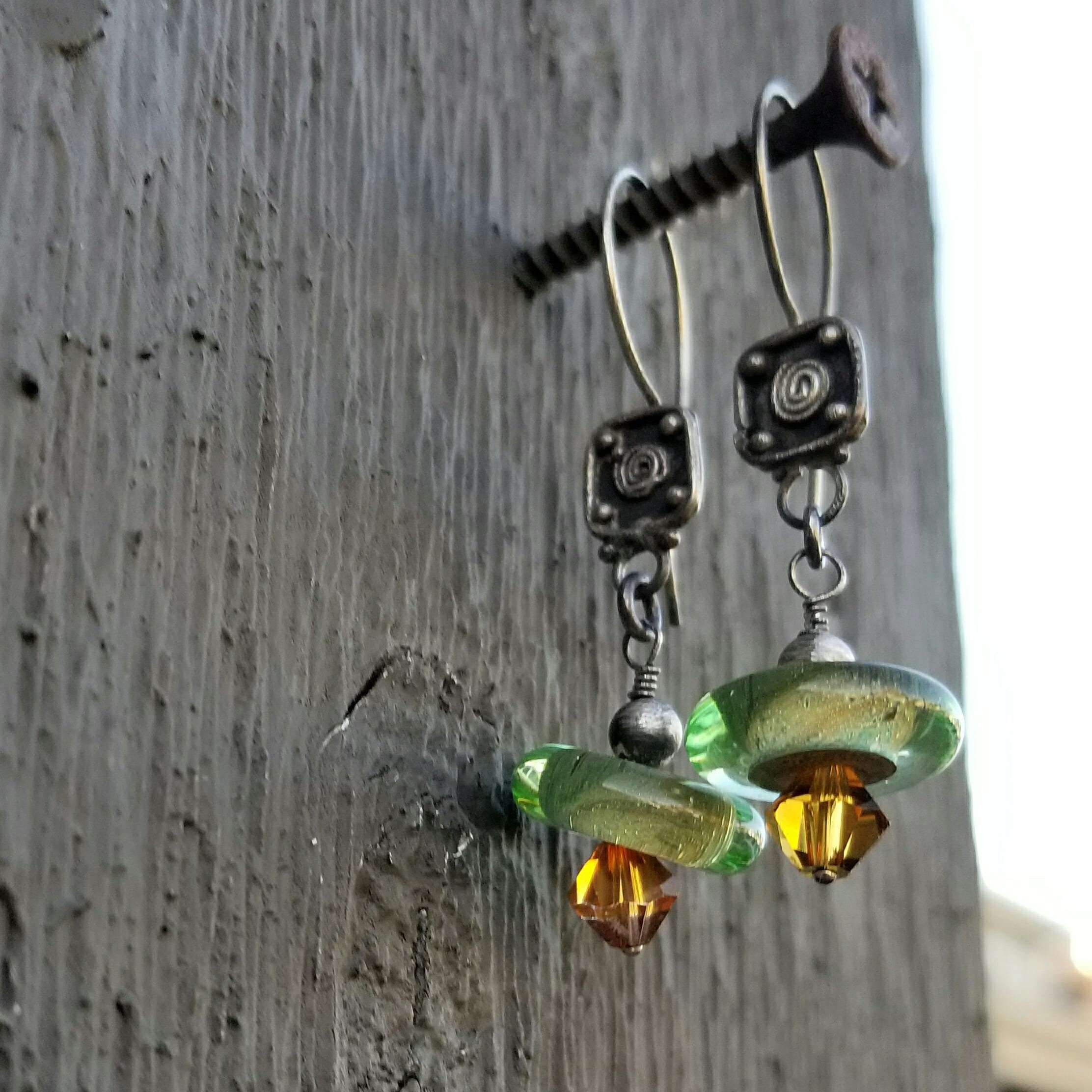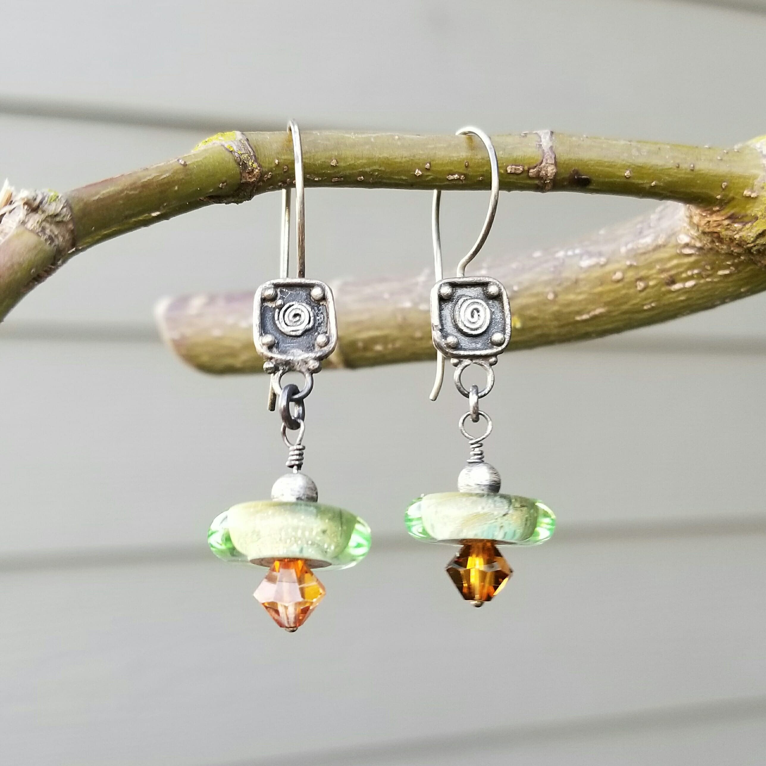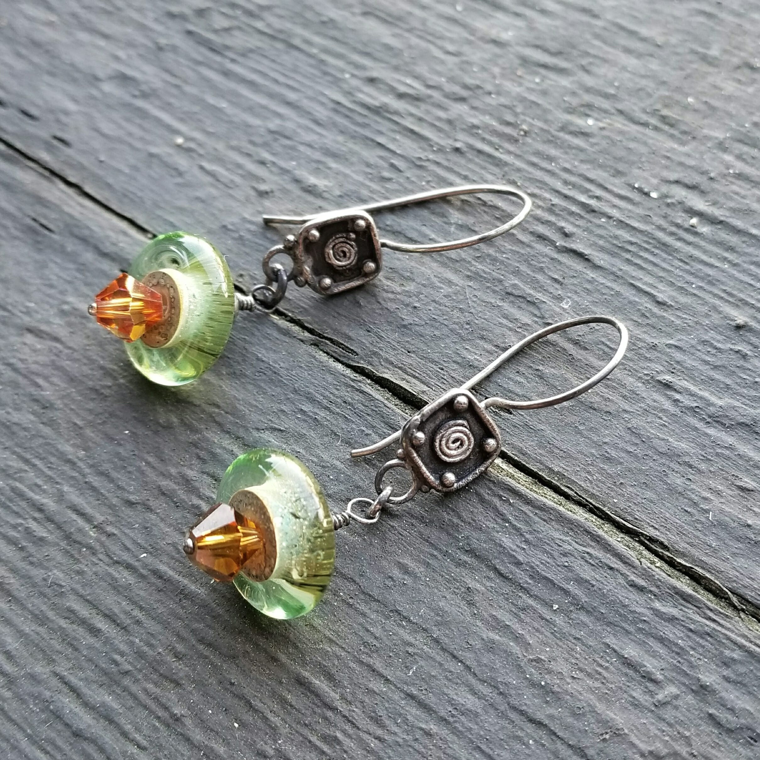 Artisan Sterling Silver, Lampwork Glass, and Swarovski Crystal Earrings with Sterling Earwires, Green and Brown, Unique and One of a Kind